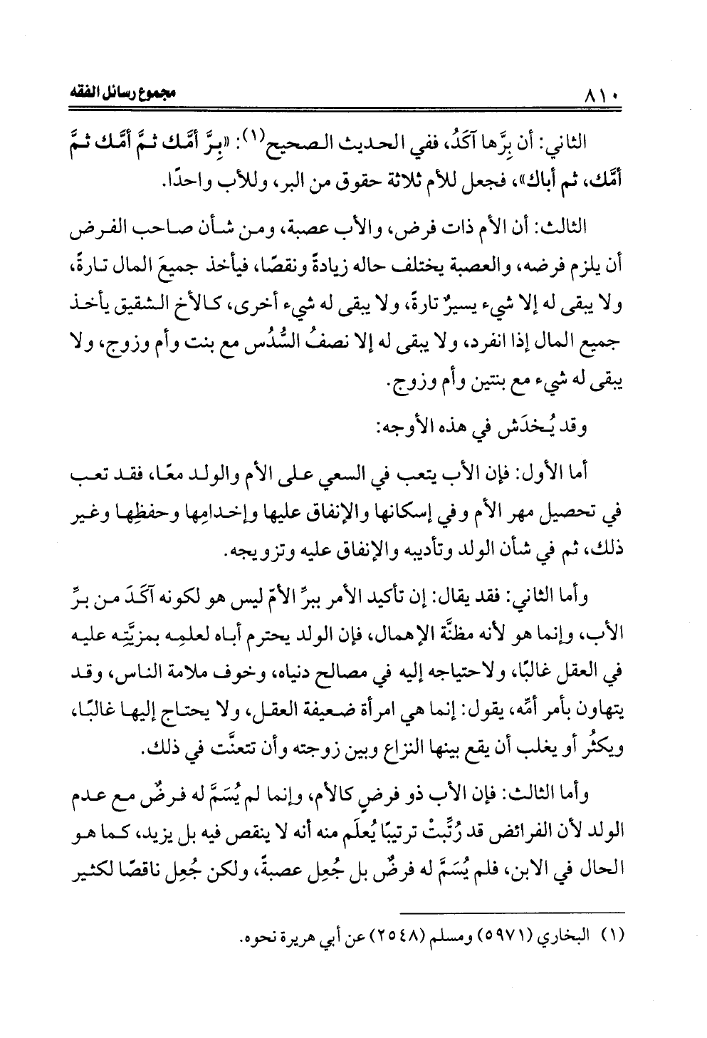 وأما الثالث: فإن الأب ذو فرضٍ كالأم، وإنما لم يُسَمَّ له فرضٌ مع عدم الولد لأن الفرائض قد رُتِّبتْ ترتيبًا يُعلَم منه أنه لا ينقص فيه بل يزيد، كما هو الحال في الابن، فلم يُسَمَّ له فرضٌ بل جُعِل عصبةً، ولكن جُعِل ناقصًا لكثير
