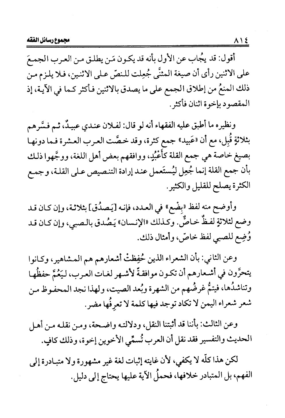 ونظيره ما أطبق عليه الفقهاء أنه لو قال: لفلان عندي عبيدٌ، ثم فسَّرهم بثلاثةٍ قُبِل، مع أن "عَبيد" جمع كثرة، وقد خصَّت العرب العشرة فما دونها بصيغ خاصة هي جمع القلة كأَعْبُدٍ، ووافقهم بعض أهل اللغة، ووجَّهوا ذلك بأن جمع القلة إنما جُعِل ليُستَعمل عند إرادة التنصيص على القلة، وجمع الكثرة يصلح للقليل والكثير.