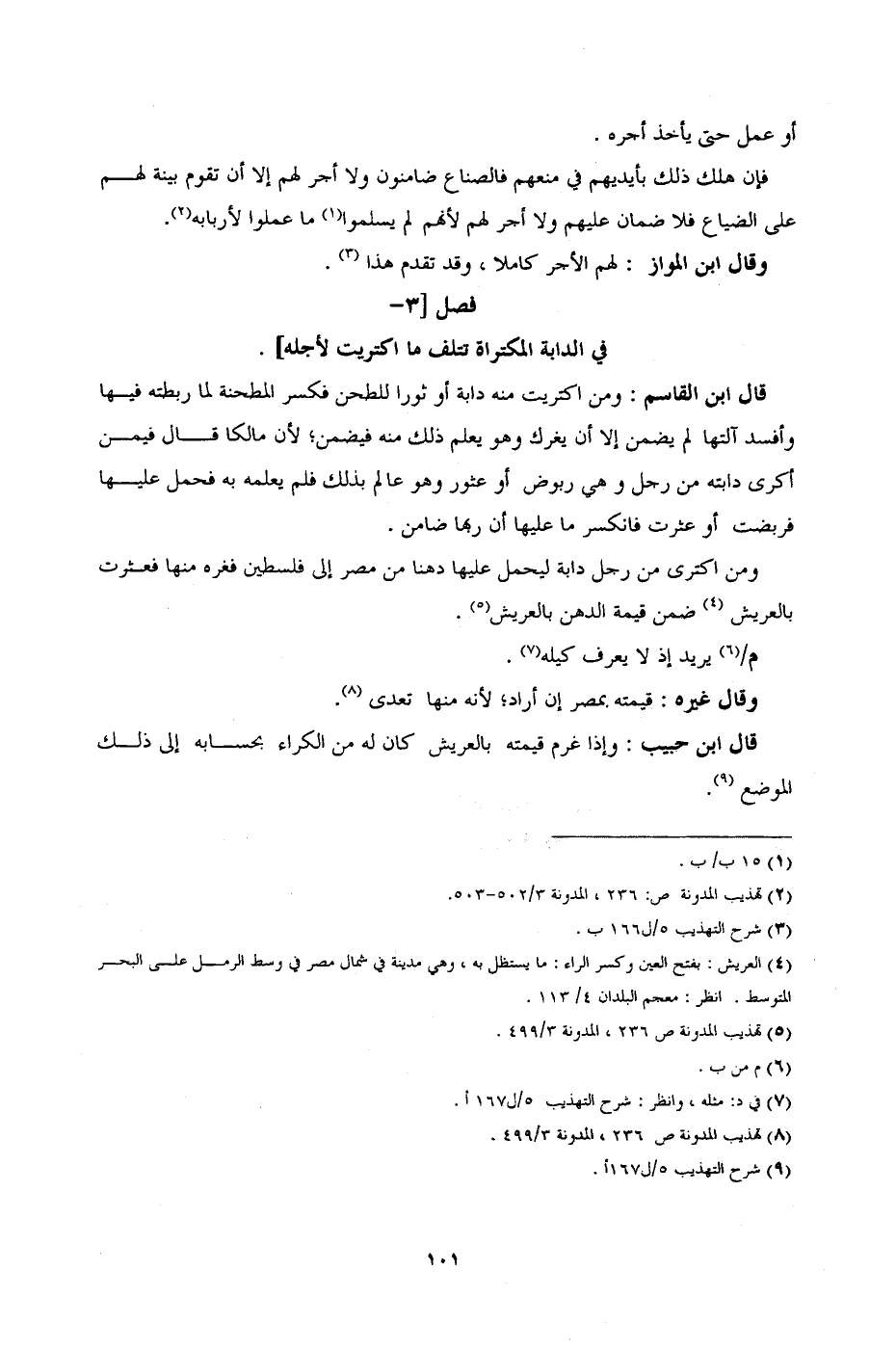 ومن اكترى من رجل دابة ليحمل عليها دهناً من مصر إلى فلسطين فغره منها فعثرت بالعريش ضمن قيمة الدهن بالعريش.