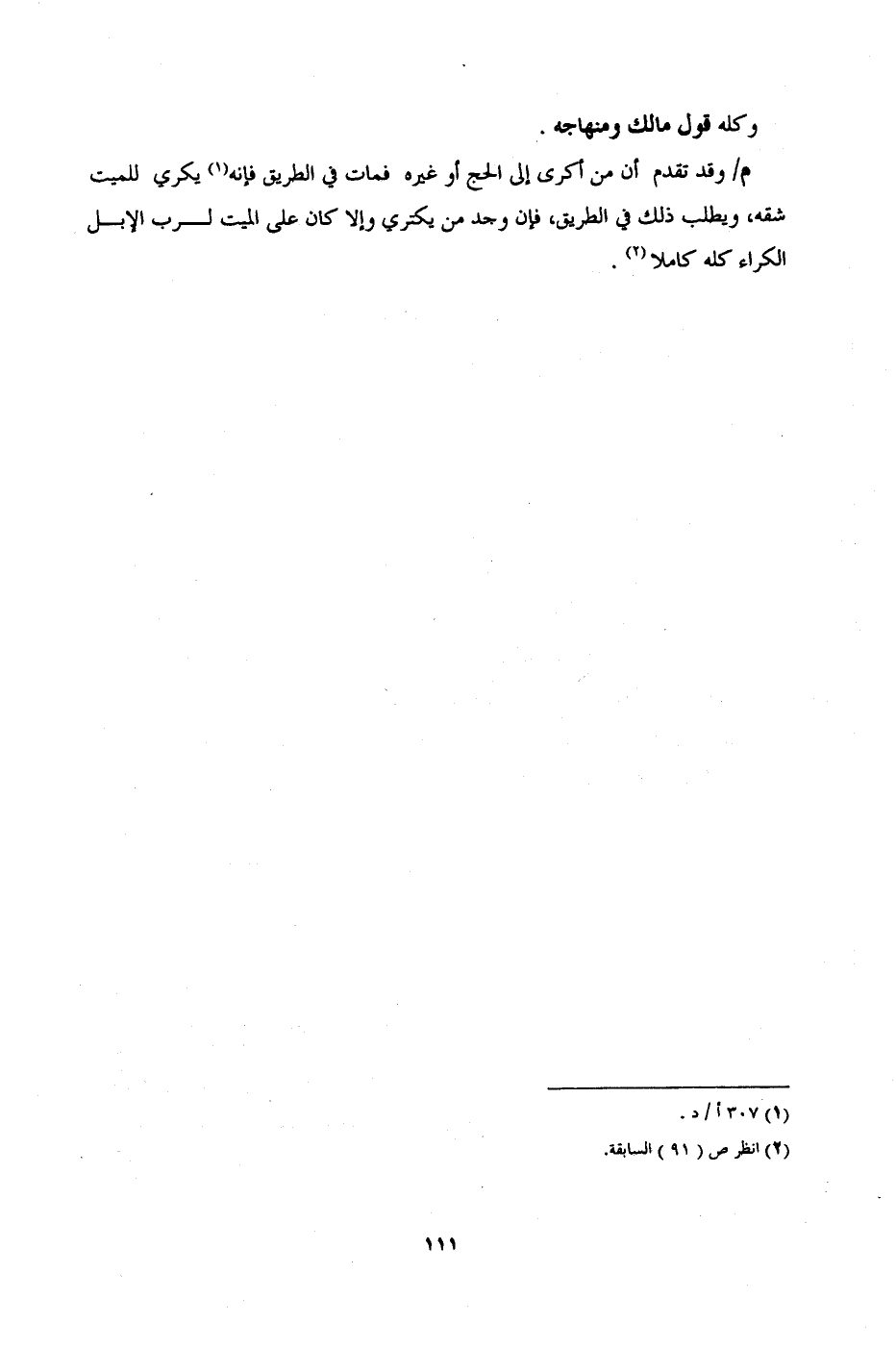 م/ وقد تقدم أن من أكرى إلى الحج أو غيره فمات في الطريق فإنه يكري للميت شقه، ويطلب ذلك في الطريق، فإن وجد من يكتري وإلا كان على الميت لرب الإبل الكراء كله كاملاً.