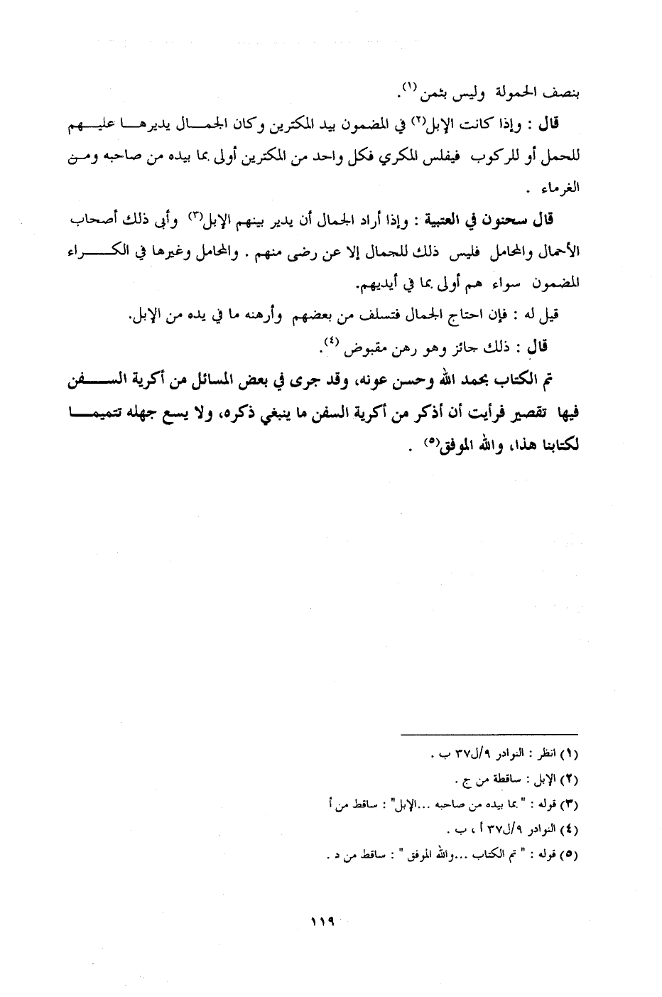 تم الكتاب بحمد الله وحسن عونه، وقد جرى في بعض المسائل من أكرية السفن فيها تقصير فرأيت أن أذكر من أكرية السفن ما ينبغي ذكره، ولا يسع جهله تتميماً لكتابنا هذا، والله الموفق.