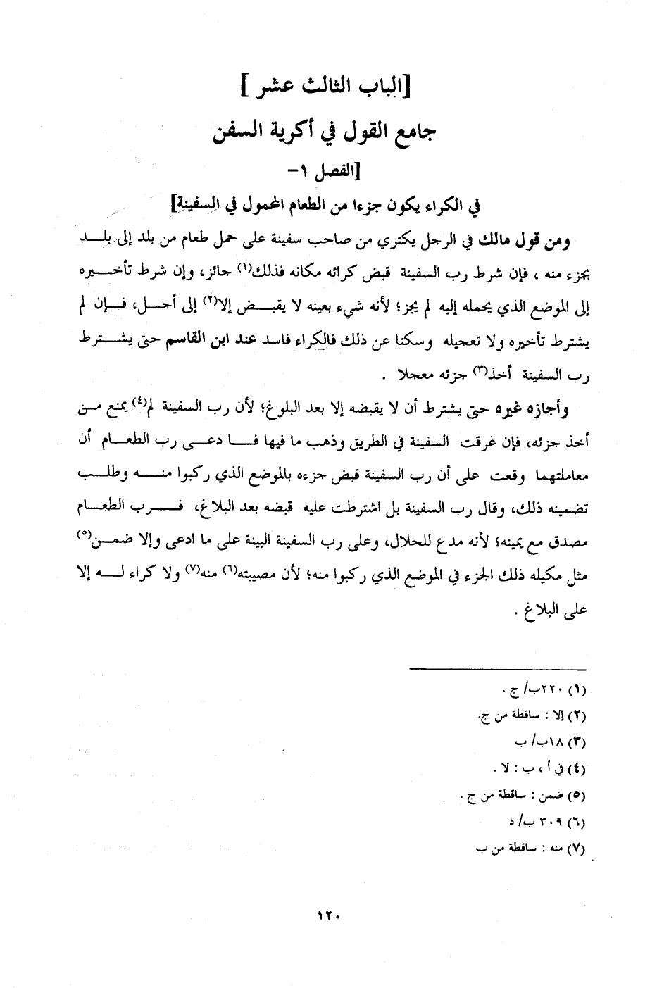 واجازه غيره حتى يشترط أن لا يقبضه إلا بعد البلوغ؛ لأن رب السفينة لم يمنع من أخذ جزئه، فإن غرقت السفينة في الطريق وذهب ما فيها فادعى رب الطعام أن معاملتهما وقعت على أن رب السفينة قبض جزءه بالموضع الذي ركبوا منه وطلب تضمينه ذلك، وقال رب السفينة بل اشترطت عليه قبضه بعد البلاغ، فرب الطعام مصدق مع يمينه؛ لأنه مدع للحلال، وعلى رب السفينة البينة على ما ادعى وإلا ضمن مثل مكيله ذلك الجزء في الموضع الذي ركبوا منه؛ لأن مصيبته منه ولا كراء له إلا على البلاغ.