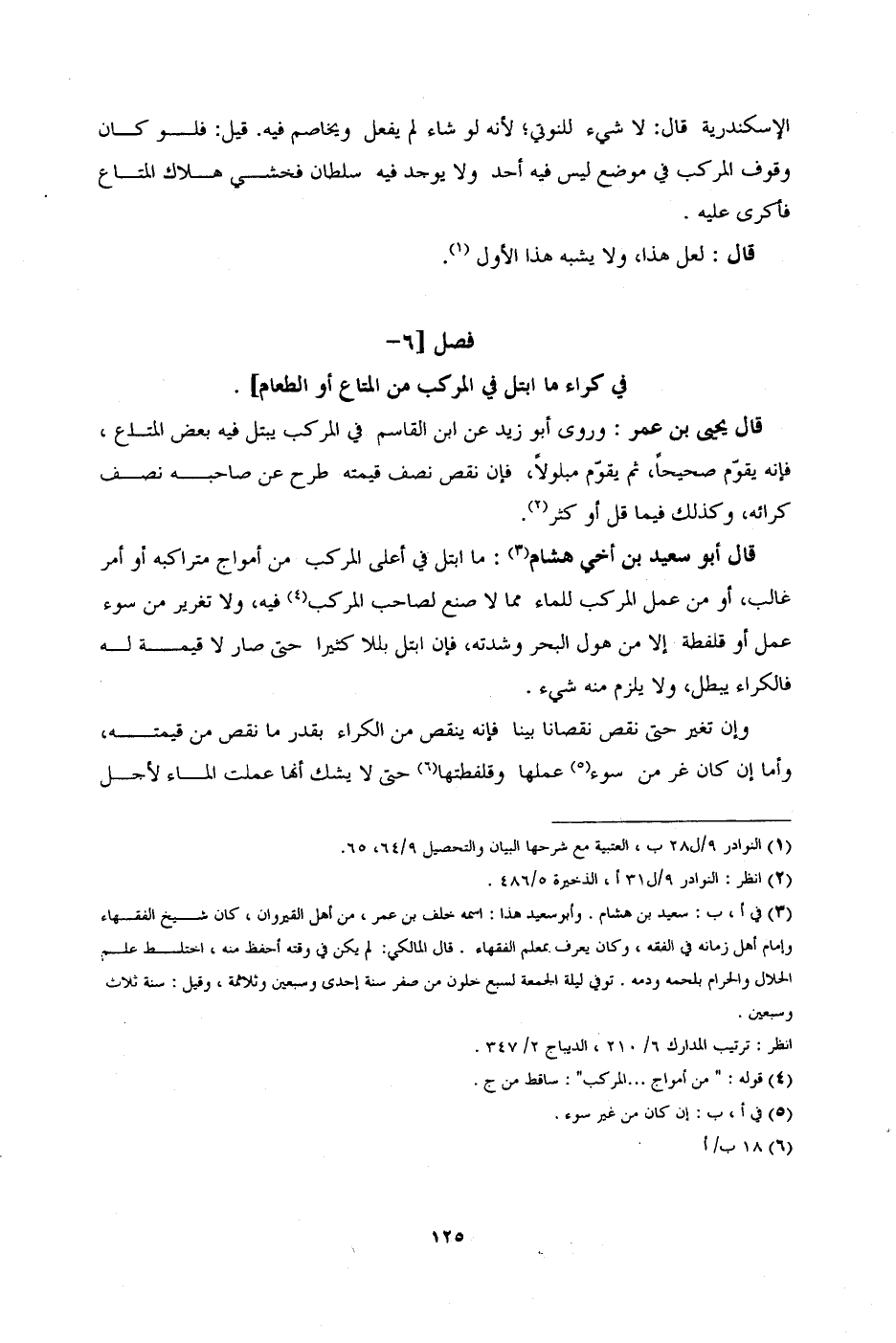 قال يحيى بن عمر: وروى أبو زيد عن ابن القاسم في المركب يبتل فيه بعض المتاع، فإنه يقوم صحيحاً، ثم يقوم مبلولاً، فإن نقص نصف قيمته طرح عن صاحبه نصف كرائه، وكذلك فيما قل أو كثر.