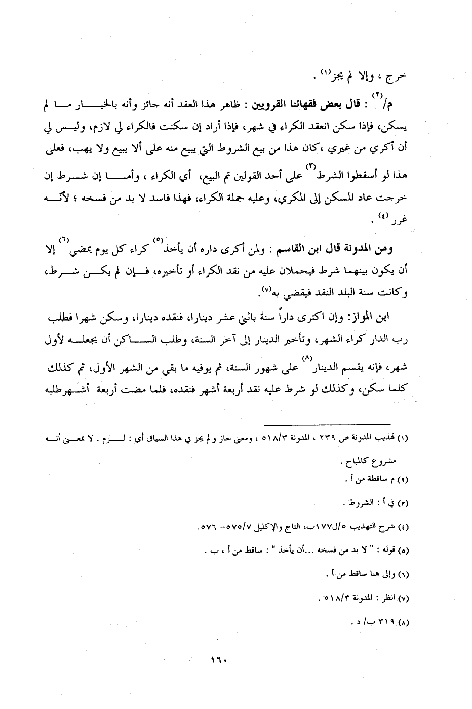م/: قال بعض فقهائنا القرويين: ظاهر هذا العقد أنه جائز وأنه بالخيار ما لم يسكن، فإذا سكن انعقد الكراء في شهر، فإذا أراد إن سكنت فالكراء لي لازم، وليس لي أن أكري من غيري، كان هذا من بيع الشروط التي يبيع منه على ألا يبيع ولا يهب، فعلى هذا لو أسقطوا الشرط على أحد القولين تم البيع، أي الكراء، وأما إن شرط إن خرجت عاد المسكن إلى المكري، وعليه جملة الكراء، فهذا فاسد لابد من فسخه؛ لأنّه غرر.