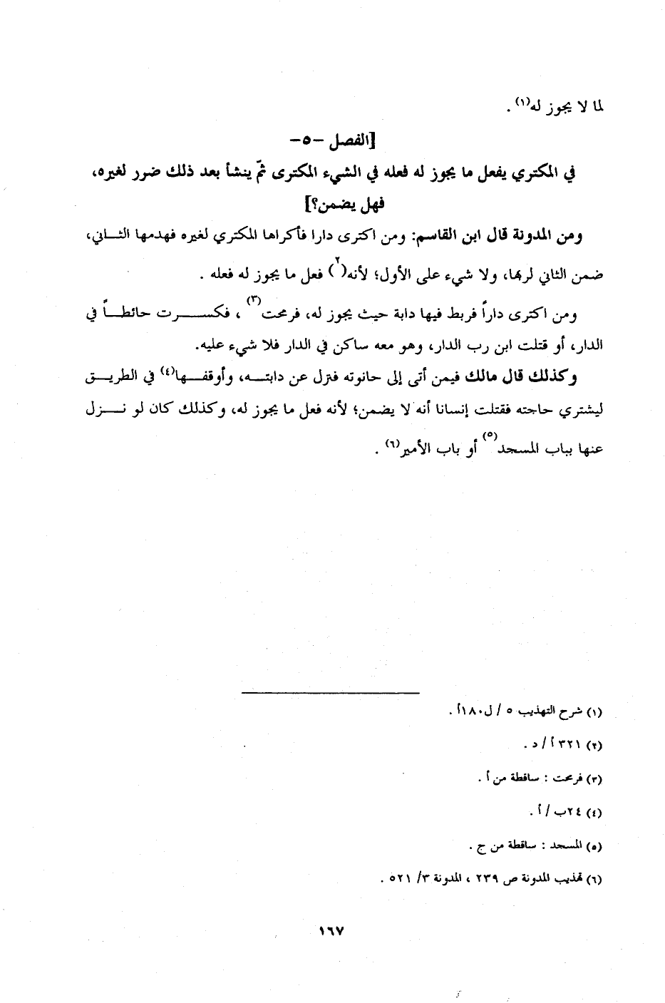 ] الفصل -5 - في المكتري يفعل ما يجوز له فعله في الشيء المكتري ثمّ ينشأ بعد ذلك ضرر لغيره، فهل يضمن؟ [