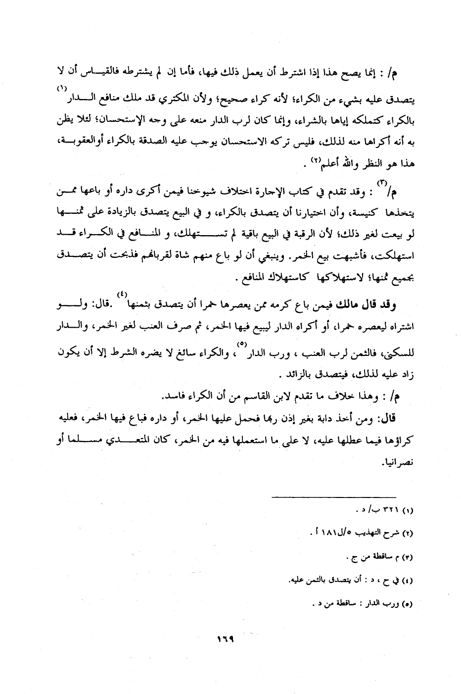 م/: وقد تقدم في كتاب الإجارة اختلاف شيوخنا فيمن أكرى داره أو باعها ممن يتخذها كنيسة، وأن اختيارنا أن يتصدق بالكراء، وفي البيع يتصدق بالزيادة على ثمنها لو بيعت لغير ذلك؛ لأن الرقبة في البيع باقية لم تستهلك، والمنافع في الكراء قد استهلكت، فأشبهت بيع الخمر. وينبغي أن لو باع منهم شاة لقربانهم فذبحت أن يتصدق بجميع ثمنها؛ لاستهلاكها كاستهلاك المنافع.