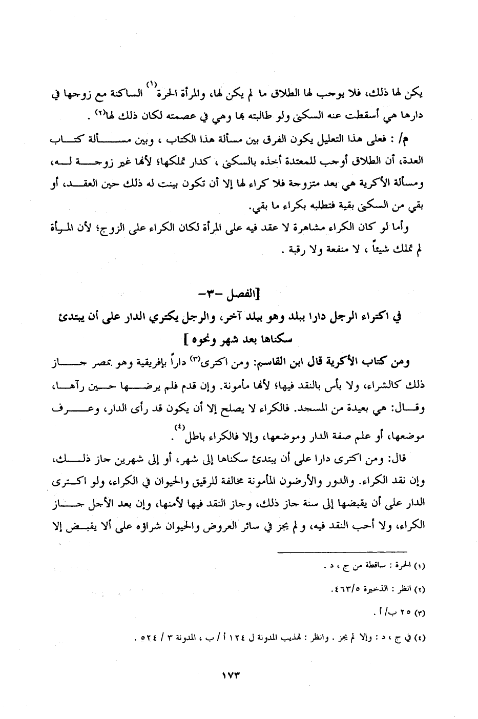 م/: فعلى هذا التعليل يكون الفرق بين مسألة هذا الكتاب، وبين مسألة كتاب العدة، أن الطلاق أوجب للمعتدة أخذه بالسكنى، كدار تمكلها؛ لأنها غير زوجة له، ومسألة الأكرية هي بعد متزوجة فلا كراء لها إلا أن تكون بينت له ذلك حين العقد، أو بقي من السكنى بقية فتطلبه بكراء ما بقي.