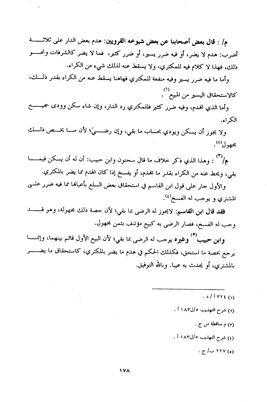 م/: وهذا الذي ذكر خلاف ما قال سحنون وابن حبيب: أن له أن يسكن فيما بقي، ويحط عنه من الكراء بقدر ما انهدم، أو يفسخ إذا كان الهدم مما يضر بالمكتري.