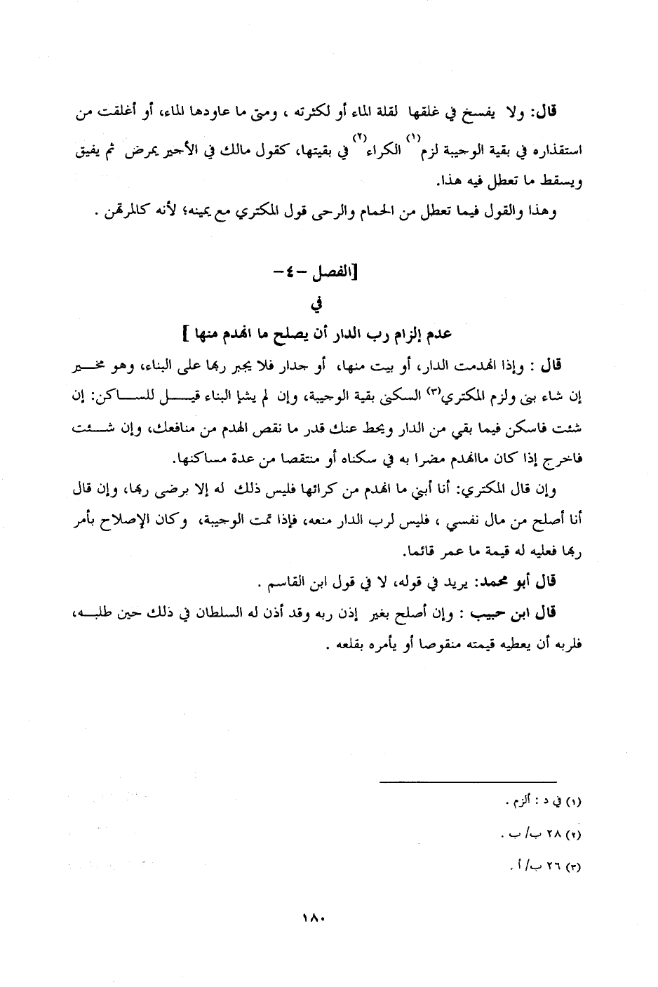 قال: وإذا انهدم الدار، أو بيت منها، أو جدار فلا يجبر ربها على البناء وهو مخير إن شاء بنى ولزم المكتري السكنى بقية الوجيبة، وإن لم يشأ البناء قيل للساكن: إن شئت فاسكن فيما بقي من الدار ويحط عنك قدر ما نقص الهدم من منافعك، وإن شئت فاخرج إذا كان ما انهدم مضراً به في سكناه أو منتقصاً من عدة مساكنها.