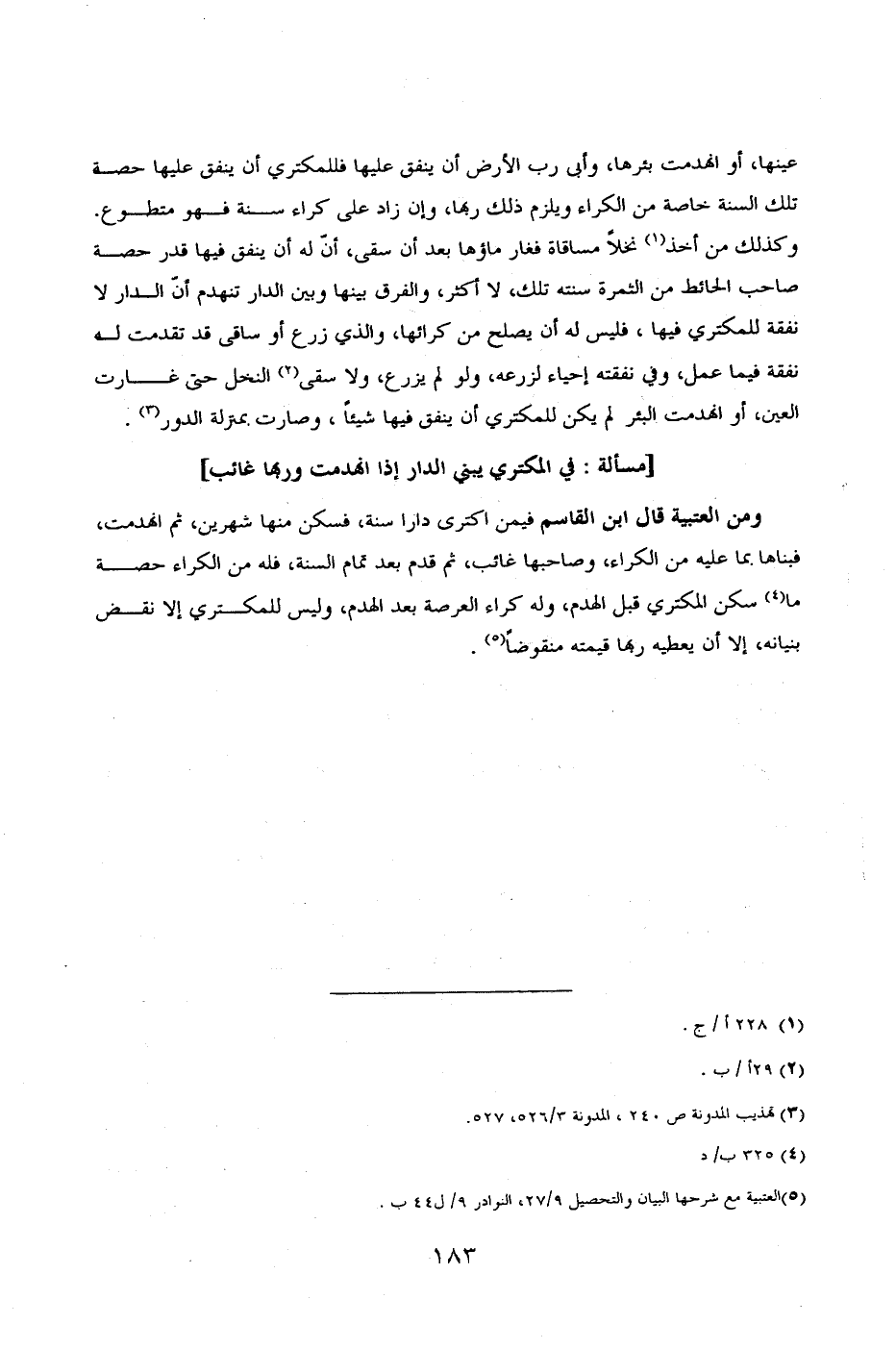 عينها أو انهدمت بئرها، وأبى رب الأرض أن ينفق عليها فللمكتري أن ينفق عليها حصة تلك السنة خاصة من الكراء ويرزم ذلك ربها، وإن زاد على كراء سنة فهو متطوع. وكذلك من أخذ نخلاً مساقاة فغار ماؤها بعد أن سقى، أن له أن ينفق فيها قدر حصة صاحب الحائط من الثمرة سنته تلك، لا أكثر، والفرق بينها وبين الدار تنهدم أن الدار لا نفقة للمكتري فيها، فليس له أن يصلح من كرائها، والذي زرع أو ساقى قد تقدمت له نفقة فيما عمل، وفي نفقته إحياء لزرعه، ولو لم يزرع، ولا سقى النخر حتى غارت العين، أو انهدمت البئر لم يكن للمكتري أن ينفق فيها شيئاً وصارت بمنزلة الدور.