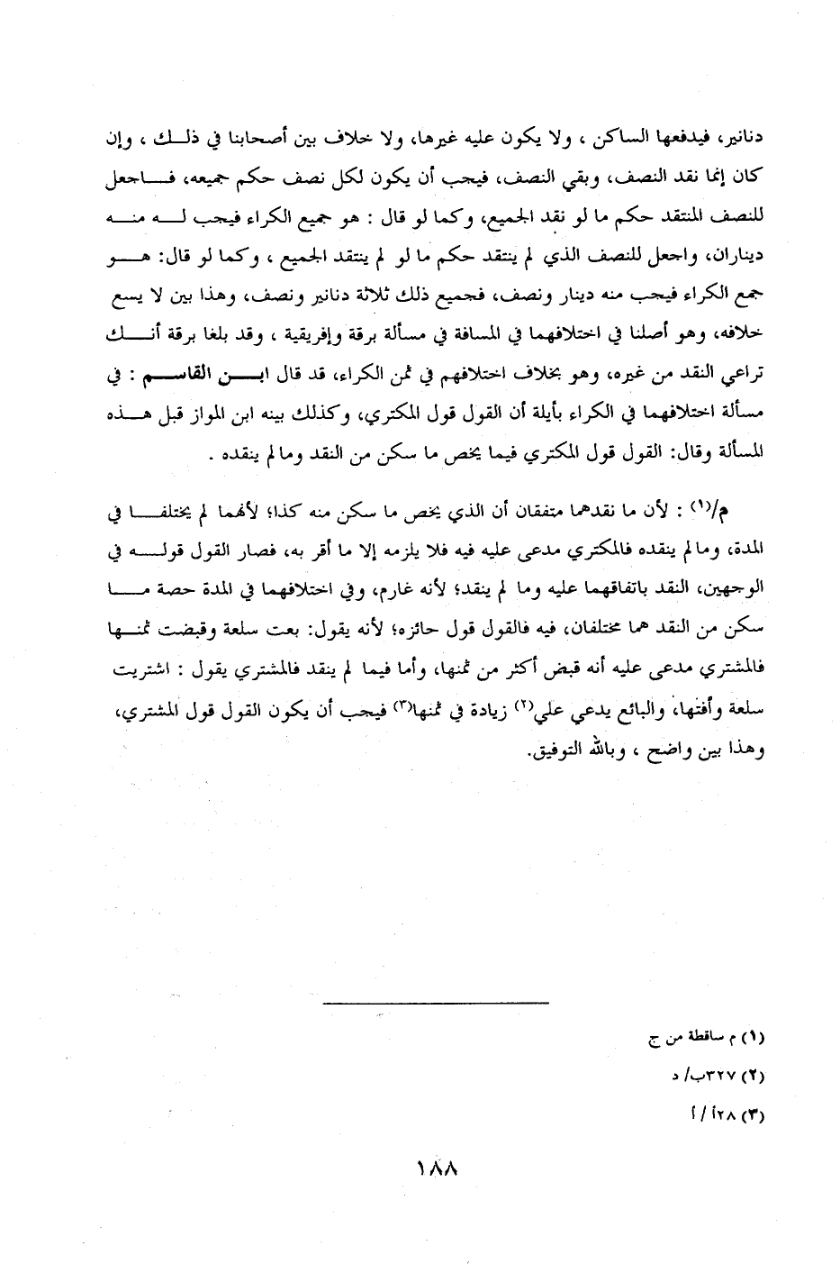 دنانير، فيدفعها الساكن، ولا يكون عليه غيرها، ولا خلاف بين أصحابنا في ذلك، وإن كان إنما نقد النصف، وبقي النصف، فيجب أن يكون لكل نصف حكم جميعه، فاجعل للنصف المنتقد حكم ما لو نقد الجميع، وكما لو قال: هو جميع الكراء فيجب له منه ديناران، واجعل للنصف الذي لم ينتقد حكم ما لو لم ينتقد الجميع، وكما لو قال: هو جمع الكراء فيجب منه دينار ونصف، فجميع ذلك ثلاثة دنانير ونصف، وهذا بين لا يسع خلافه، وهو أصلنا في اختلافهما في المسافة في مسألة برقة وإفريقية، وقد بلغا برقة أنك تراعي النقد من غيره، وهو بخلاف اختلافهم في ثمن الكراء، قد قال ابن القاسم: في مسألة اختلافهما في الكراء بأيلة أن القول قول المكتري، وكذلك بينه ابن المواز قبل هذه المسألة وقال: القول قول المكتري فيما يخص ما سكن من النقد وما لم ينقده.
