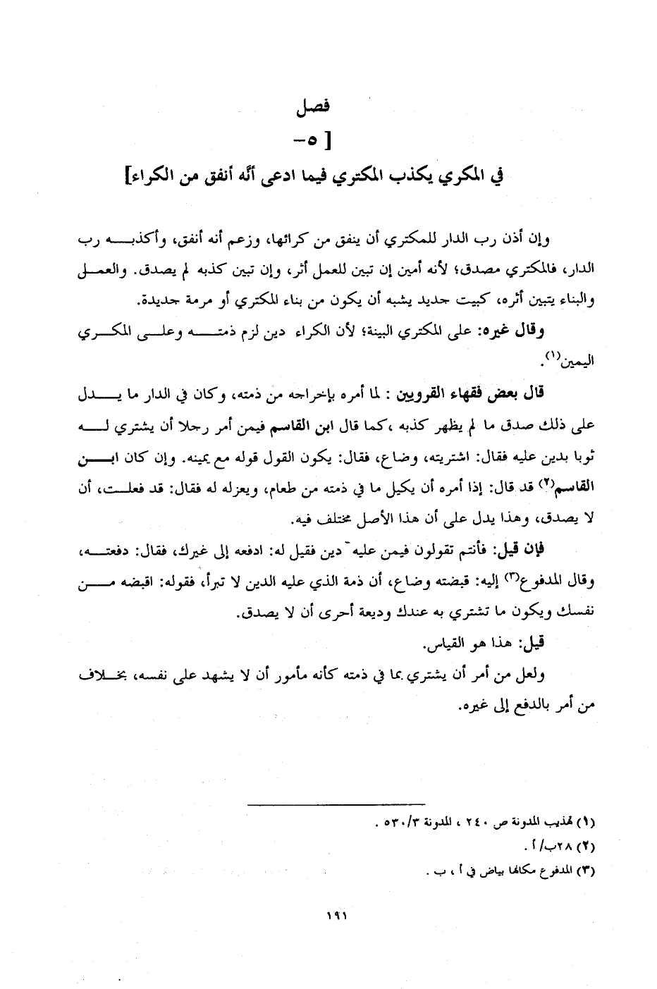 وإن إذن رب الدار للمكتري أن ينفق من كرائها، وزعم أنه أنفق، وأكذبه رب الدار، فالمكتري مصدق؛ لأنه أمين إن تبين للعمل أثر، وإن تبين كذبه لم يصدق. والعمل والبناء يتبين أثره، كبيت جديد يشبه أن يكون من بناء المكتري أو مرمة جديدة.