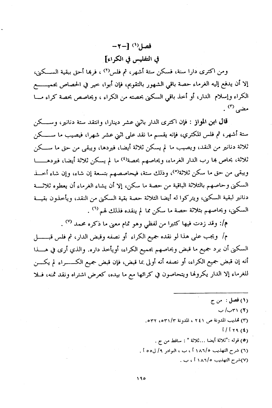 م/ ويجب على هذا لو نقده جميع الكراء أو نصفه وقبض الدار، ثم فلس قبل السكنى أن يرى جميع ما قبض ويحاصهم بجميع الكراء، أو يأخذ داره. والذي أرى في هذا أنه إن قبض جميع الكراء، أو نصفه أنه أولى بما قبض، فإن قبض جميع الكراء لم يكن للغرماء إلا الدار يكرونها ويتحاصون في كرائها مع ما بيده، كعرض اشتراه ونقد ثمنه، فلا