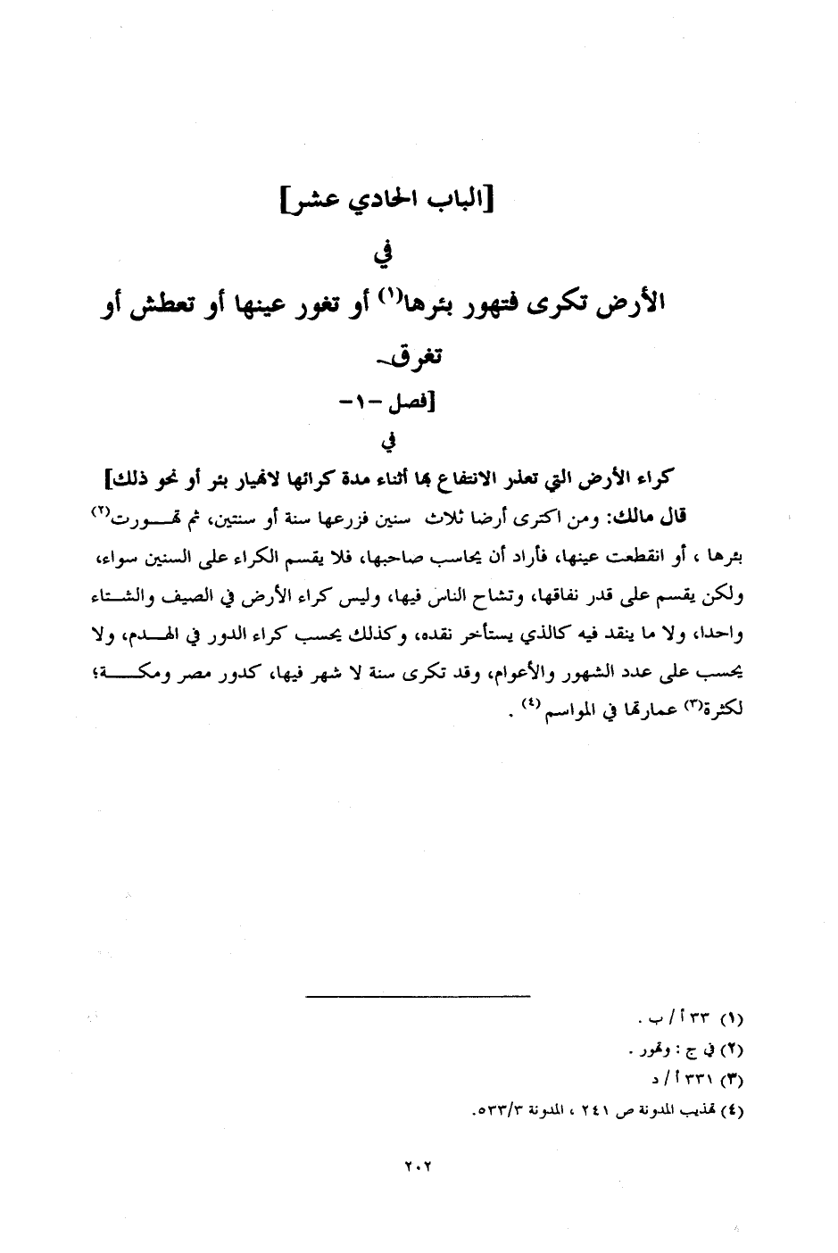 قال مالك: ومن اكترى أرضاً ثلاث سنين فزرعها سنة أو سنتين، ثم تهورت بئرها، أو انقطعت عينها، فأراد أن يحاسب صاحبها، فلا يقسم الكراء على السنين سواء، ولكن يقسم على قدر نفاقها، وتشاح الناس فيها، وليس كراء الأرض في الصيف والشتاء واحداً، ولا ما ينقد فيه كالذي يستأخر نقده، وكذلك يحسب كراء الدور في الهدم، ولا يحسب على عدد الشهور والأعوام، وقد تكرى سنة لا شهر فيها، كدور مصر ومكة؛ لكثرة عمارتها في المواسم.