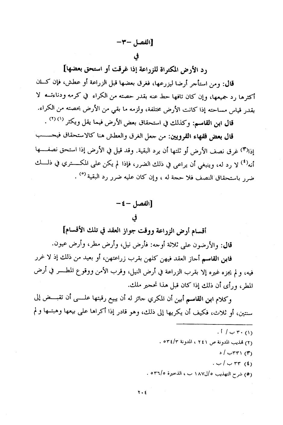 فابن القاسم: أجاز العقد فيهن كلهن بقرب زراعتهن، أو بعيد من ذلك إذ لا غرر فيه، ولم يجزه غيره إلا بقرب الزراعة في أرض النيل، وقرب الأمن ووقوع المطر في أرض المطر، ورأى أن ذلك إذا كان قبل هذا تحجير ملك.