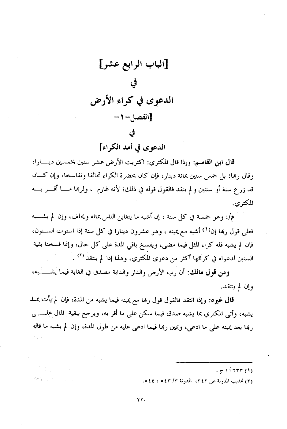 قال ابن القاسم: وإذا قال المكتري: اكتريت الأرض عشر سنين بخمسين ديناراً، وقال ربها: بل خمس سنين بمائة دينار، فإن كان بحضرة الكراء تحالفا وتفاسخا، وإن كان قد زرع سنة أو سنتين ولم ينقد فالقول قوله في ذلك؛ لأنه غارم، ولربها ما أقر به المكتري.