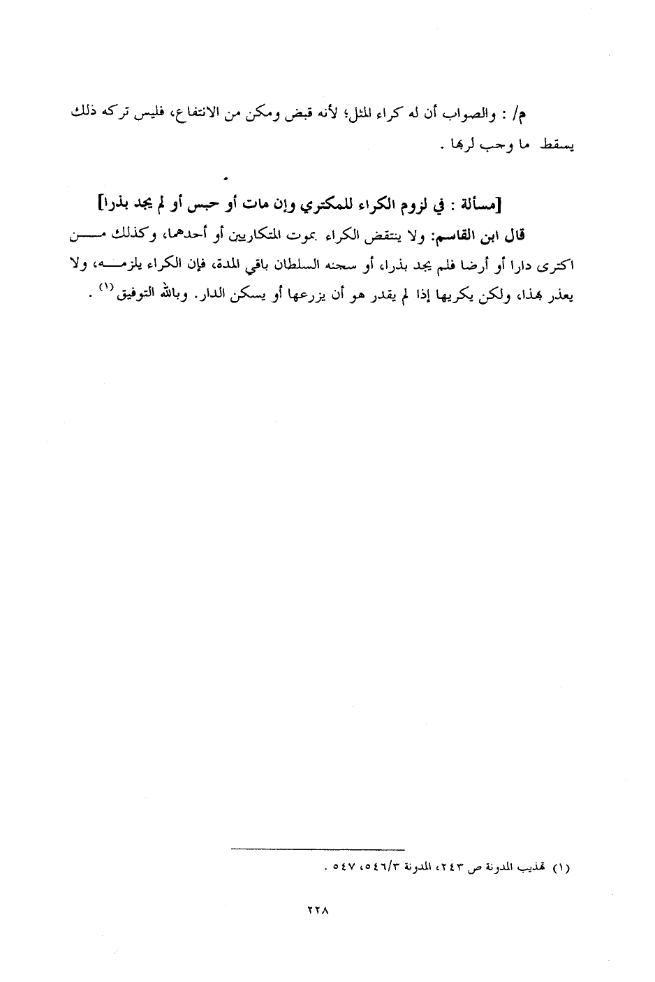 قال ابن القاسم: ولا ينتقض الكراء بموت المتكاريين أو أحدهما، وكذلك من اكترى داراً أو أرضاً فلم يجد بذراً، أو سجنه السلطان باقي المدة، فإن الكراء يلزمه، ولا يعذر بهذا، ولكن يكريها إذا لم يقدر هو أن يزرعها أو يسكن الدار. وبالله التوفيق.