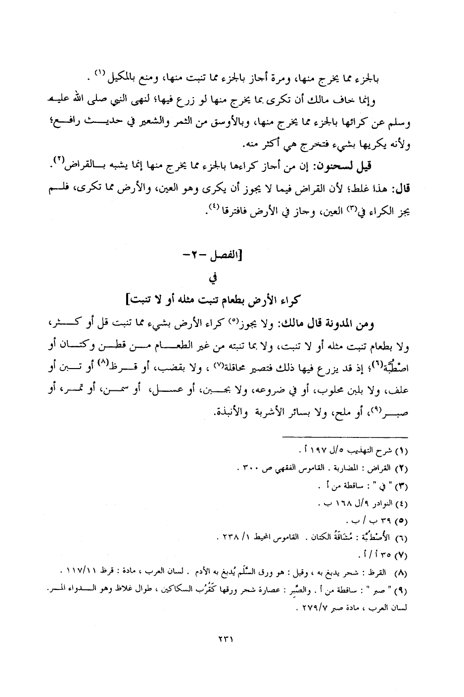 ومن المدونة قال مالك: ولا يجوز كراء الأرض بشيء مما ينبت قل أو كثر، ولا بطعام تنبت مثله أو لا تنبت، ولا بما تنبته من غير الطعام من قطن وكتان أو اصطبه؛ إذ قد يزرع فيها ذلك فتصير محاقلة، ولا بقضب، أو قرظ أو تبن أو علف، ولا بلبن محلوب، أو في ضروعه، ولا بجبن، أو عسل، أو سمن، أو تمر، أو صبر، أو ملح، ولا بسائر الأشربة والأنبذة.