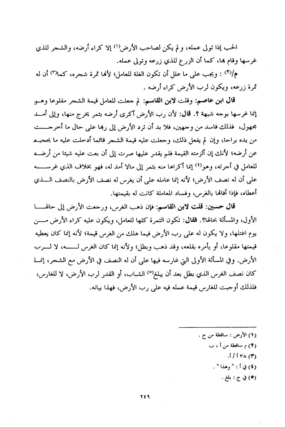 قال ابن عاصم: وقلت لابن القاسم: لم جعلت للعامل قيمة الشجر مقلوعاً وهو إنما غرسها بوجه شبهة؟. قال: لأن رب الأرض أكرى أرضه بثمر يخرج منها، وإلى أمد مجهول، فذلك فاسد من وجهين، فلابد أن ترد الأرض إلى ربها على حال ما أخرجت من يده براحاً، وإن لم يفعل ذلك، وجعلت عليه قيمة الشجر قائماً أدخلت عليه ما يحجبه عن أرضه؛ لأنك إن ألزمته القيمة فلم يقدر عليها صرت إلى أن بعت عليه شيئاً من أرضه للعامل في أجرته، وهو إنما أكراها منه بثمر إلى مالا أمد له، فهو بخلاف الذي غرسه على أن له نصف الأرض؛ لأنه إنما عامله على أن يغرس له نصف الأرض بالنصف الذي أعطاه، فإذا أفاتها بالغرس، وفساد المعاملة كانت له بقيمتها.