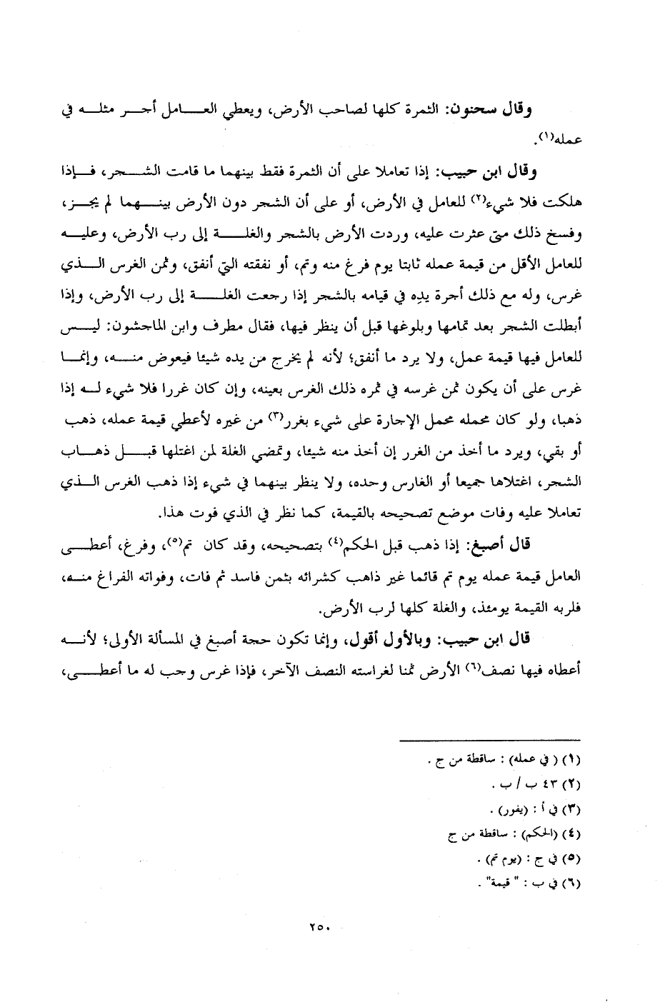 قال ابن حبيب: وبالأول أقول، وإنما تكون حجة أصبغ في المسألة الأولى؛ لأنه أعطاه فيها نصف الأرض ثمناً لغراسته النصف الآخر، فإذا غرس وجب له ما أعطى،