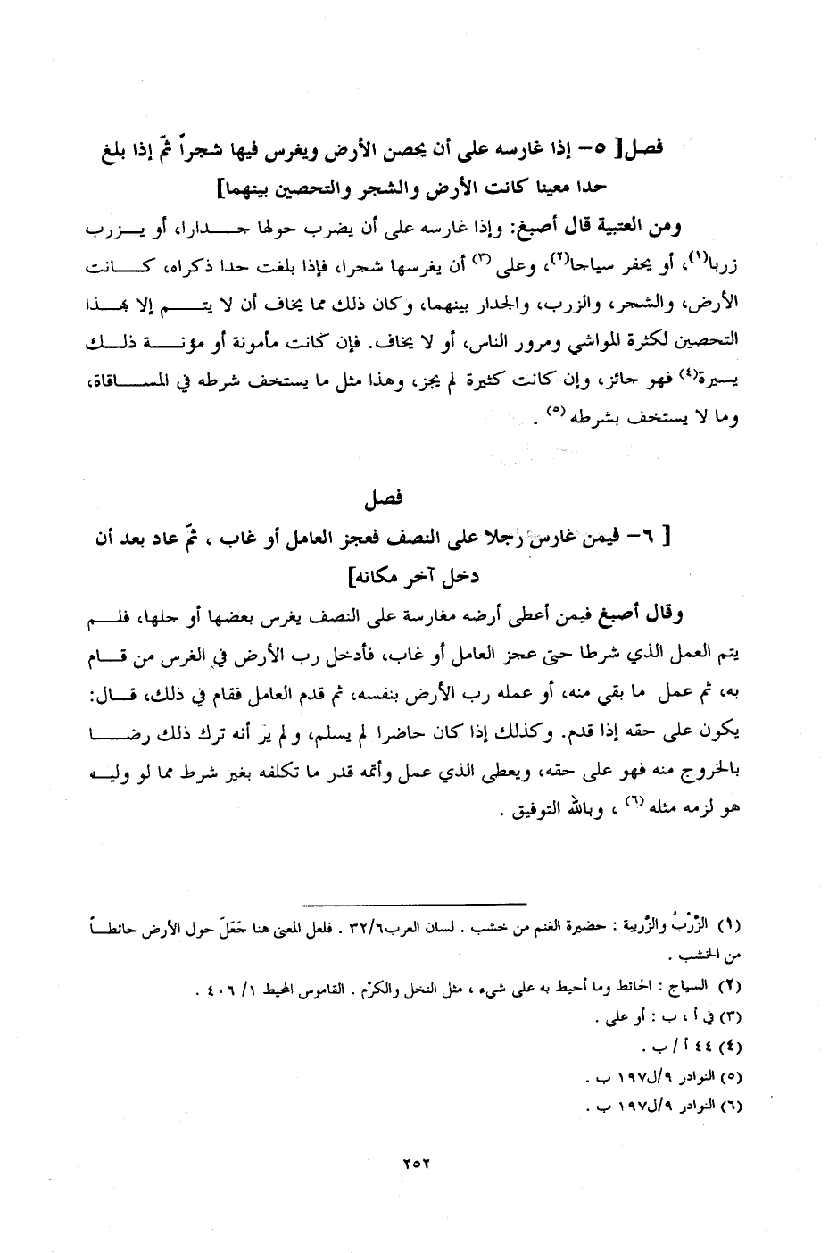 ومن العتبية قال أصبغ: وإذا غارسه على أن يضرب حولها جداراً، أو يزرب زرباً، أو يحفر سياجاً، وعلى أن يغرسها شجراً، فإذا بلغت حداً ذكراه، كانت الأرض، والشجر، والزرب، والجدار بينهما، وكان ذلك مما يخاف أن لا يتم إلا بهذا التحين لكثرة المواشي ومرور الناس، أو لا يخاف. فإن كانت مأمونة أو مؤنة ذلك يسيرة فهو جائز، وإن كانت كثيرة لم يجز، وهذا مثل ما يستخف شرطه في المساقاة، وما لا يستخف بشرطه.