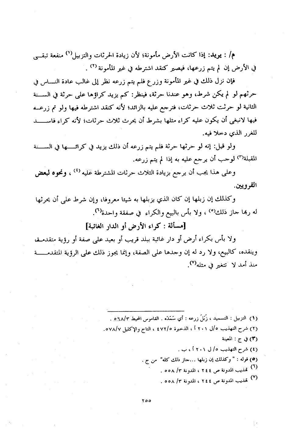 م/: يريد: إذا كانت الأرض مأمونة؛ لأن زيادة الحرثات والتزبيل منفعة تبقى في الأرض إن لم يتم زرعها، فيصير كنقد اشترطه في غير المأمونة.