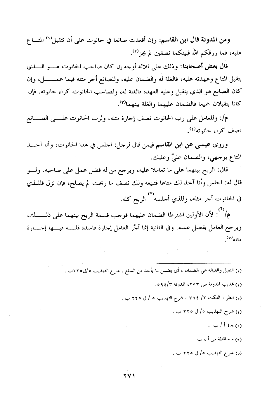 قال بعض أصحابنا: وذلك على ثلاثة أوجه إن كان صاحب الحانوت هو الذي يتقبل المتاع وعهدته عليه, فالغلة له والضمان عليه, وللصانع أجر مثله فيما عمل, وإن كان الصانع هو الذي يتقبل وعليه العهدة فالغلة له, ولصاحب الحانوت كراء حانوته. فإن كانا يتقبلان جميعا فالضمان عليهما والغلة بينهما.