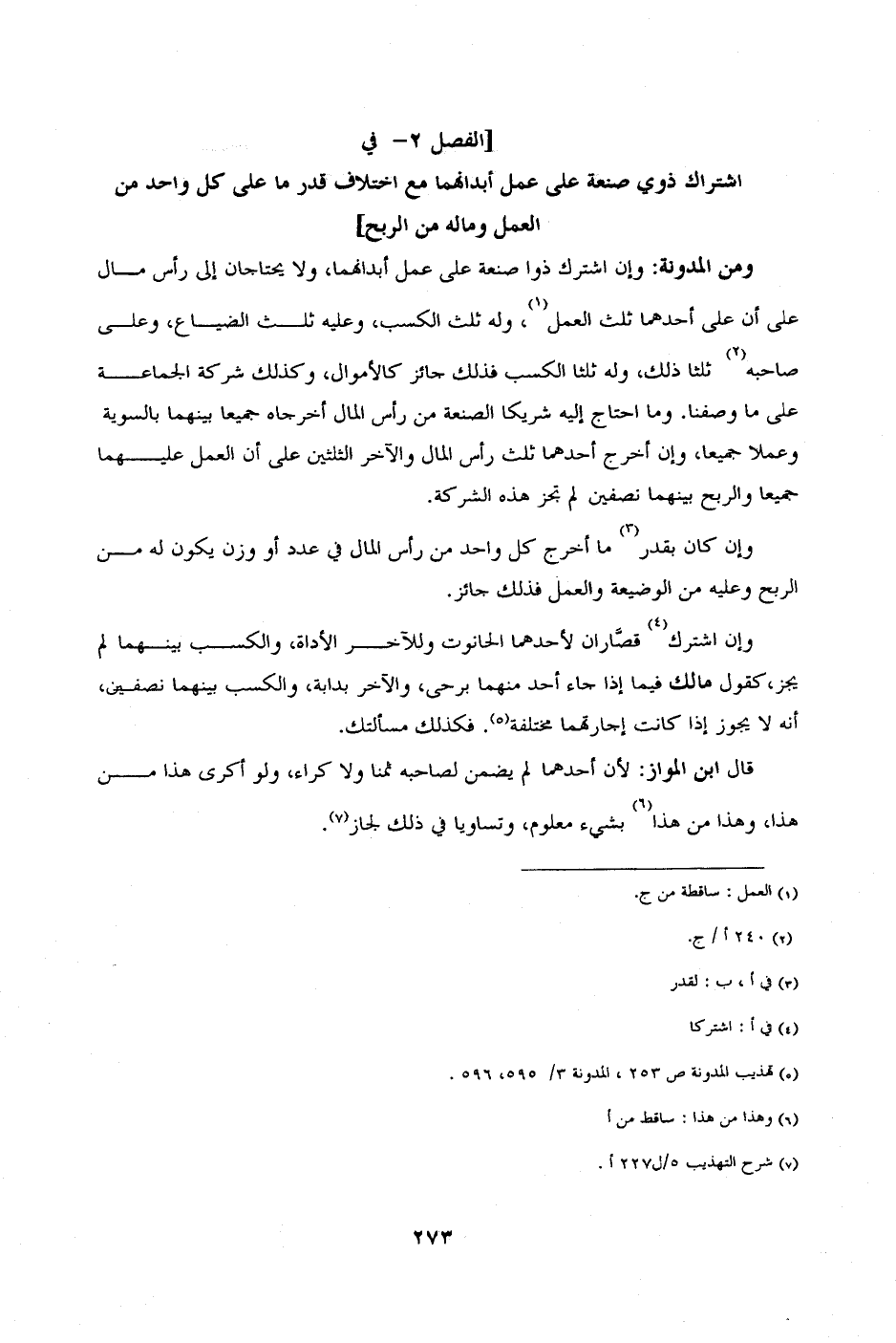 ومن المدونة: وإن اشترك ذوا صنعة على عمل أبدانهما, ولا يحتاجان إلى رأس مال على أن على أحدهما ثلث العمل, وله ثلث الكسب, وعليه ثلث الضياع, وعلى صاحبه ثلثا ذلك, وله ثلثا الكسب فذلك جائز كالأموال, وكذلك شركة الجماعة على ما وصفنا. وما احتاج إليه شريكا الصنعة من رأس المال أخرجاه جميعا بينهما بالسوية وعملا جميعا, وإن أخرج أحدهما ثلث رأس المال والآخر الثلثين على أن العمل عليهما جميعا والربع بينهما نصفين لم تجز هذه الشركة.