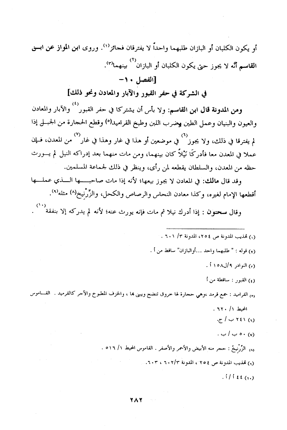 ومن المدونة قال ابن القاسم: ولا بأس أن يشتركا في حفر القبور والآبار والمعادن والعيون والبنيان وعمل الطين وضرب اللبن وطبخ القراميد وقطع الحجارة من الجبل إذا لم يفترقا في ذلك، ولا يجوز من موضعين أو هذا في غار وهذا في غار من المعدن، فإن عملا في المعدن معا، فأدركا نيلاً كان بينهما، ومن مات منهما بعد إدراكه النيل لم يورث حظه من المعدن، والسلطان يقطعه لمن رأى، وينظر في ذلك لجماعة المسلمين.