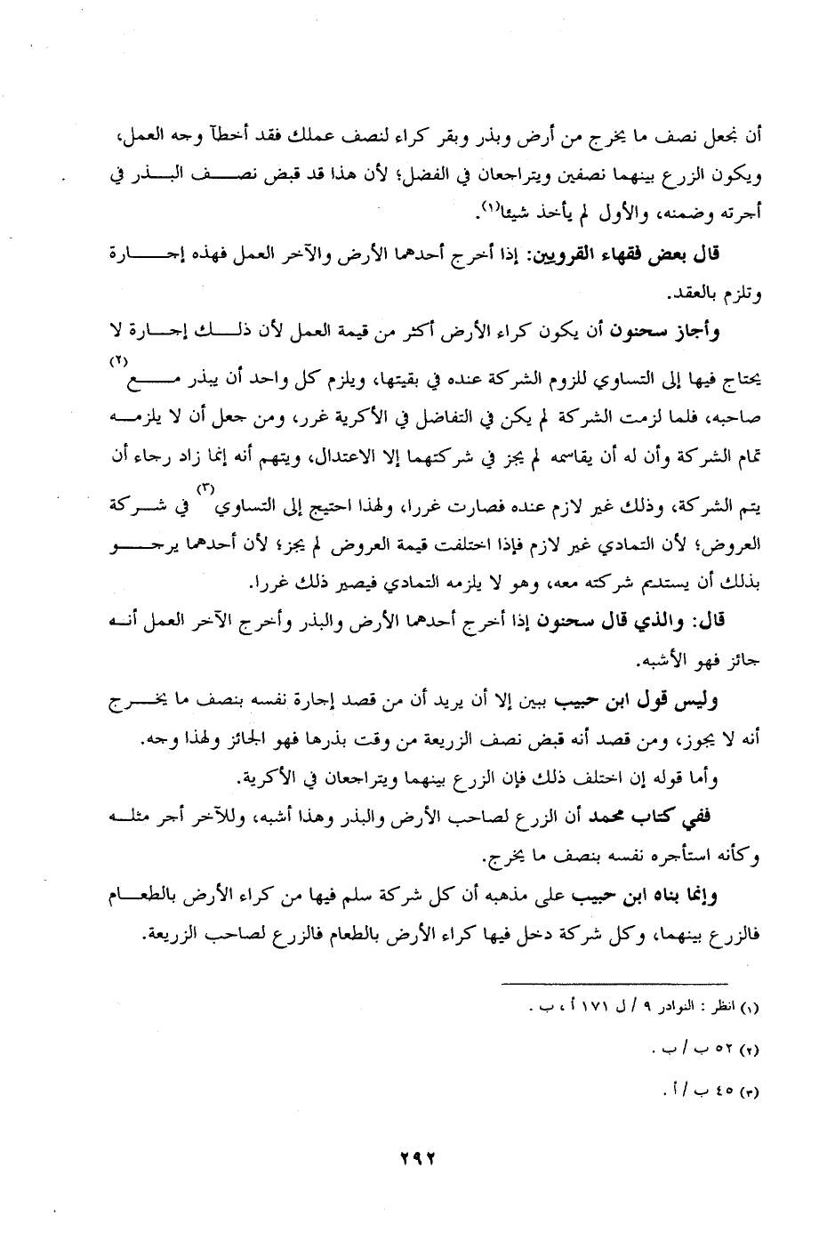 وإنما بنا ابن حبيب على مذهبه أن كل شركة سلم فيها من كراء الأرض بالطعام فالزرع بينهما، وكل شركة دخل فيها كراء الرض بالطعام فالزرع لصاحب الزريعة.