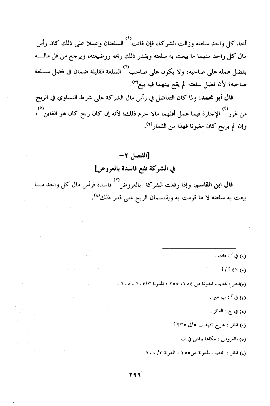أخذ كل واحد سلعته وزالت الشركة، فإن فاتت السلعتان وعملا على ذلك كان رأس مال كل واحد منهما ما بيعت به سلعته وبقدر ذلك ربحه ووضيعته، ويرجع من قل ماله بفضل عمله على صاحبه، ولا يكون على صاحب السلعة القليلة ضمان في فضل سلعة صاحبه؛ لأن فضل سلعته لم يقع بينهما فيه بيع.