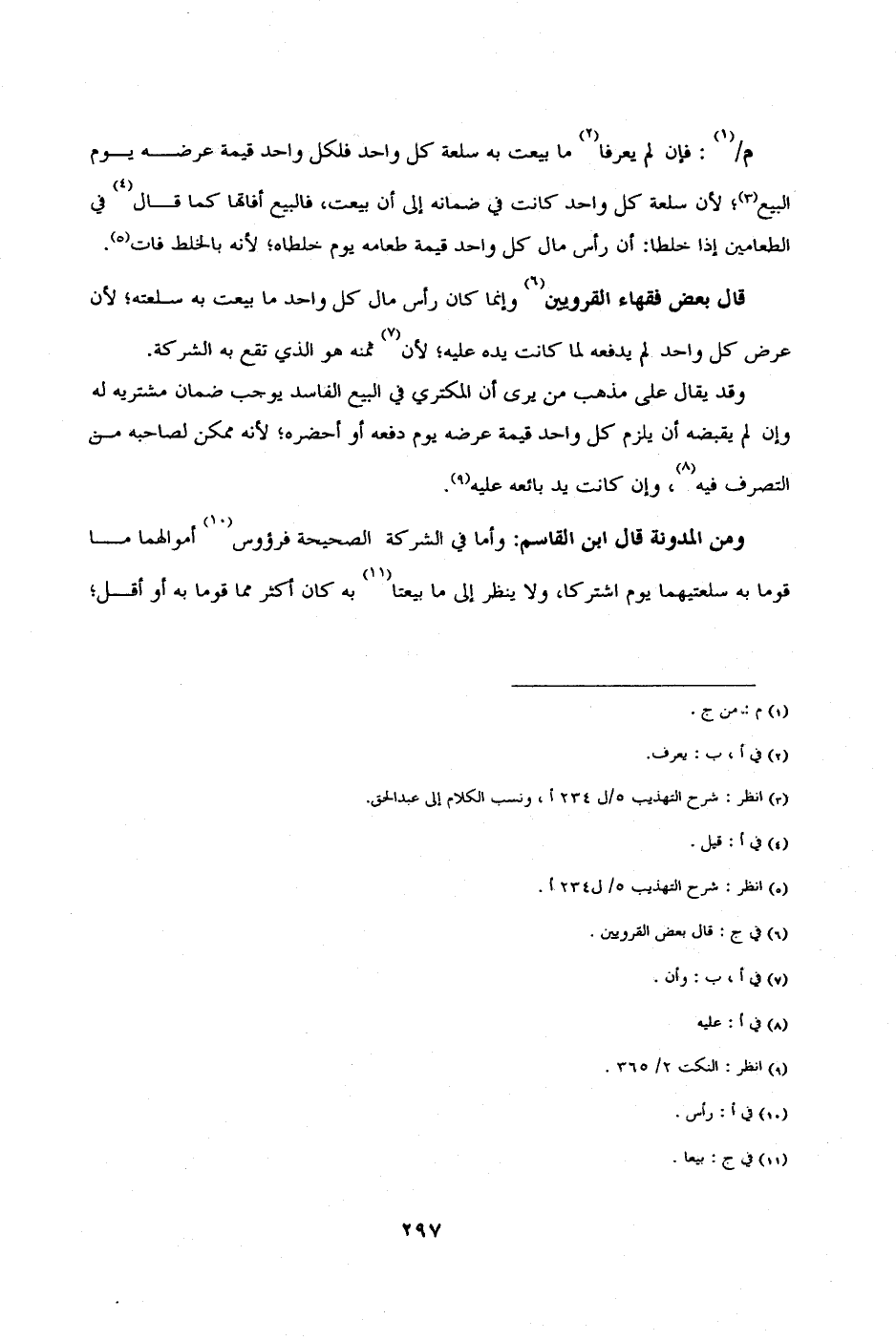 قال بعض فقهاء القرويين: وإنما كان رأس مال كل واحد ما بيعت به سلعته؛ لأن عرض كل واحد لم يدفعه لما كانت يده عليه؛ لأن ثمنه هو الذي تقع به الشركة.