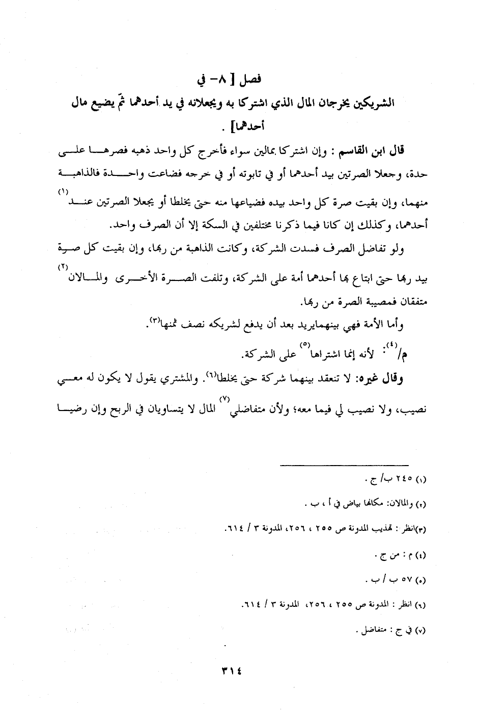 [فصل 8 - في الشريكين يخرجان المال الذي اشتركا به ويجعلانه في يد أحدهما ثم يضيع مال أحدهما].