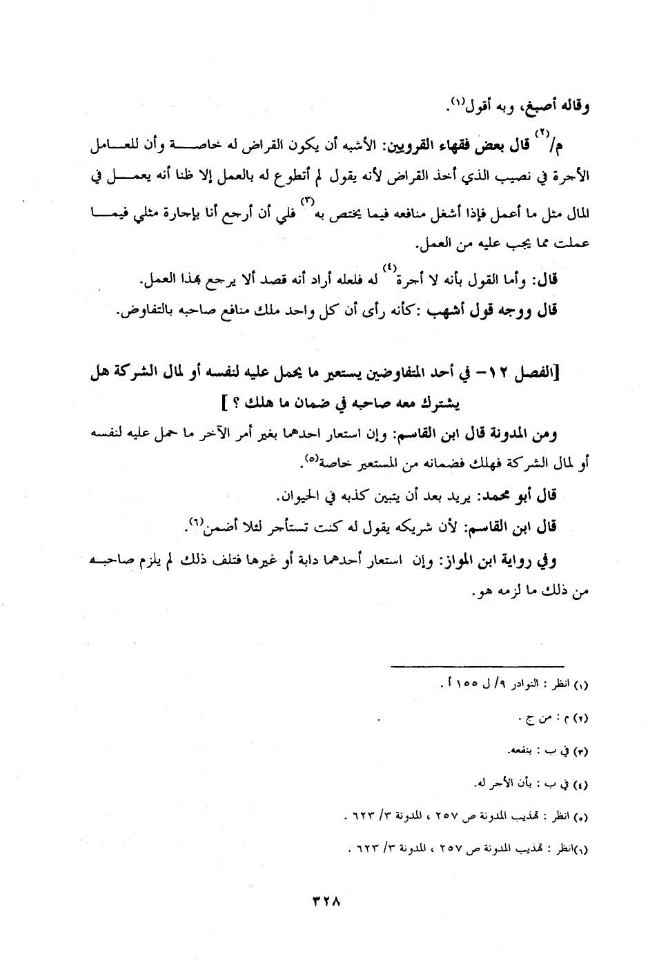 [الفصل 12 - في أحد المتفاوضين يستعير ما يحمل عليه لنفسه أو لمال الشركة هل يشترك معه صاحبه في ضمان ما هلك؟]