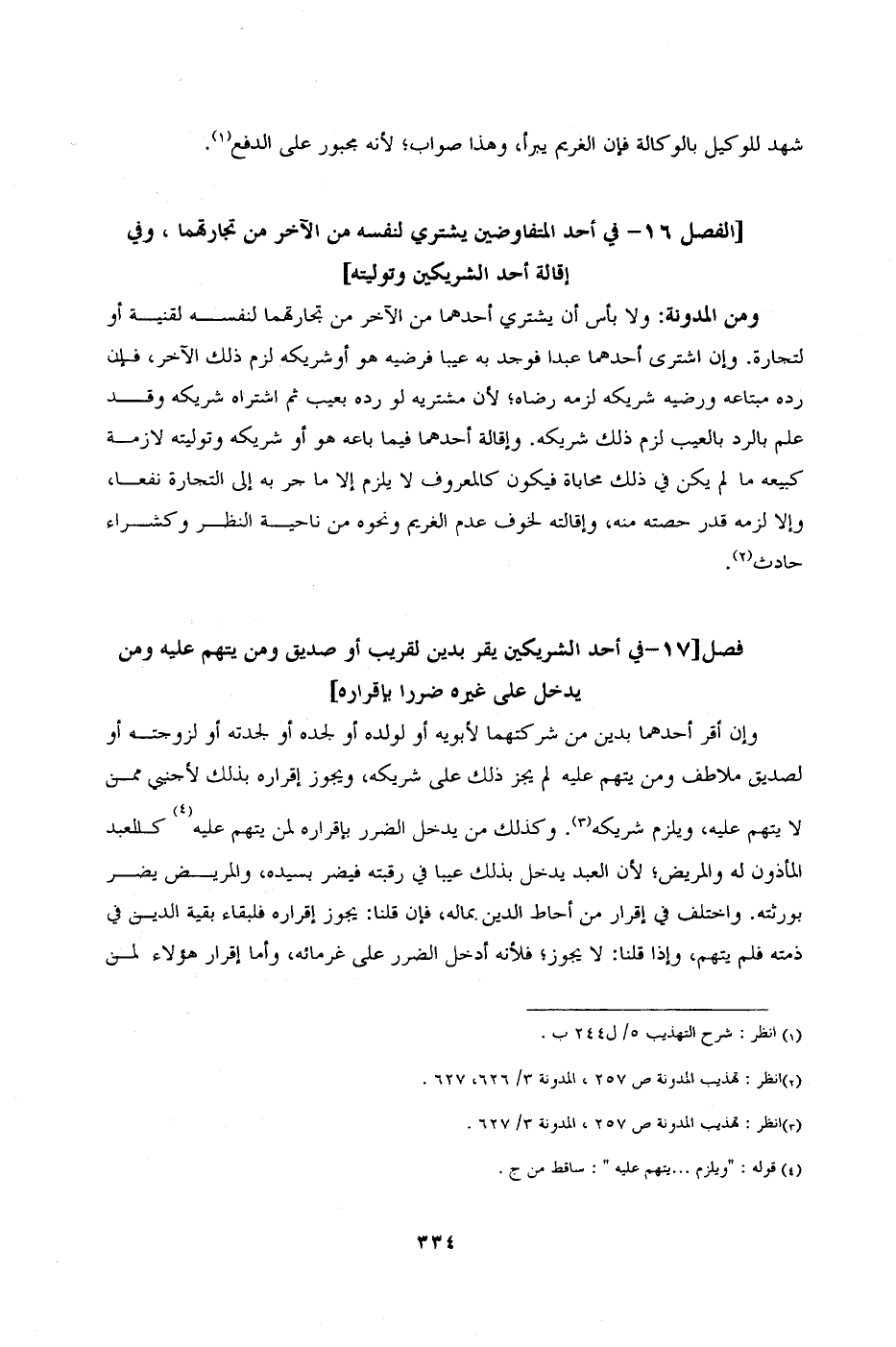 [الفصل 16 - في أحد المتفاوضين يشتري لنفسه من الآخر من تجارتهما، وفي إقالة أحد الشريكين وتوليته]