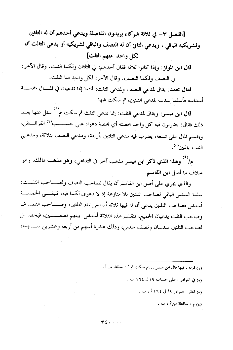 [الفصل 3 - في ثلاثة شركاء يريدون المفاصلة ويدعي أحدهم أن له الثلثين ولشريكيه الباقي، ويدعي الثاني أن له النصف والباقي لشريكيه أو يدعي الثالث أن لكل واحد منهم الثلث]