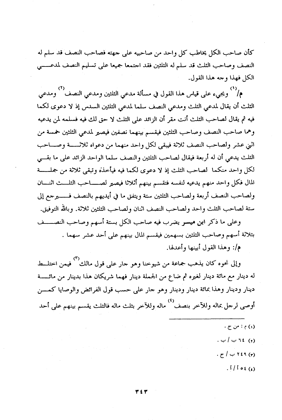 وعلى ما ذكر ابن ميسر يضرب فيه صاحب الكل بستة أسهم وصاحب النصف بثلاثة أسهم وصاحب النصف بثلاثة أسهم وصاحب الثلثين بسهمين فيقسم المال بينهم على أحد عشر سهما.