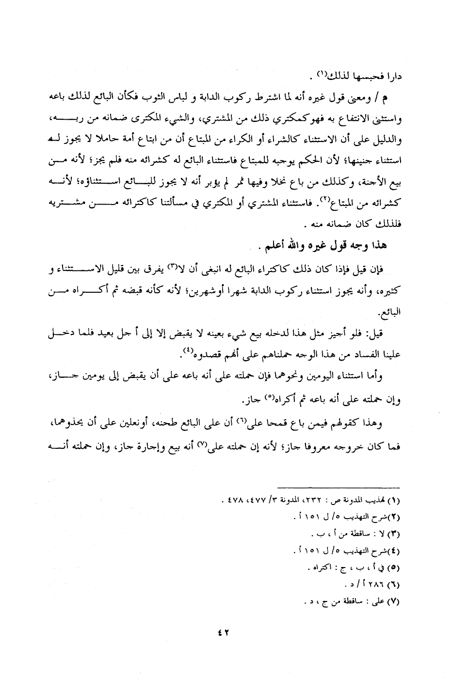 م/ ومعنى قول أنه لما اشترط ركوب الدابة ولباس الثوب فكأن البائع لذلك باعه واستثنى الانتفاع به فهو كمكتري ذلك من المشترى، والشيء المكترى ضمانه من ربه، والدليل على أن الاستثناء كالشراء أو الكراء من المبتاع أن من ابتاع امة حاملاً لا يجوز له استثناء جنينها؛ لأن الحكم يوجبه للمبتاع فاستثناء البائع له كشرائه منه فلم يجز؛ لأنه من بيع الأجنة، وكذلك من باع نخلاً وفيها ثمر لم يؤبر أنه لا يجوز للبائع استثناؤه؛ لأنه كشرائه من المبتاع. فاستثناء المشترى أو المكترى في مسألتنا كاكترائه من مشتريه فلذلك كان ضمانه منه.