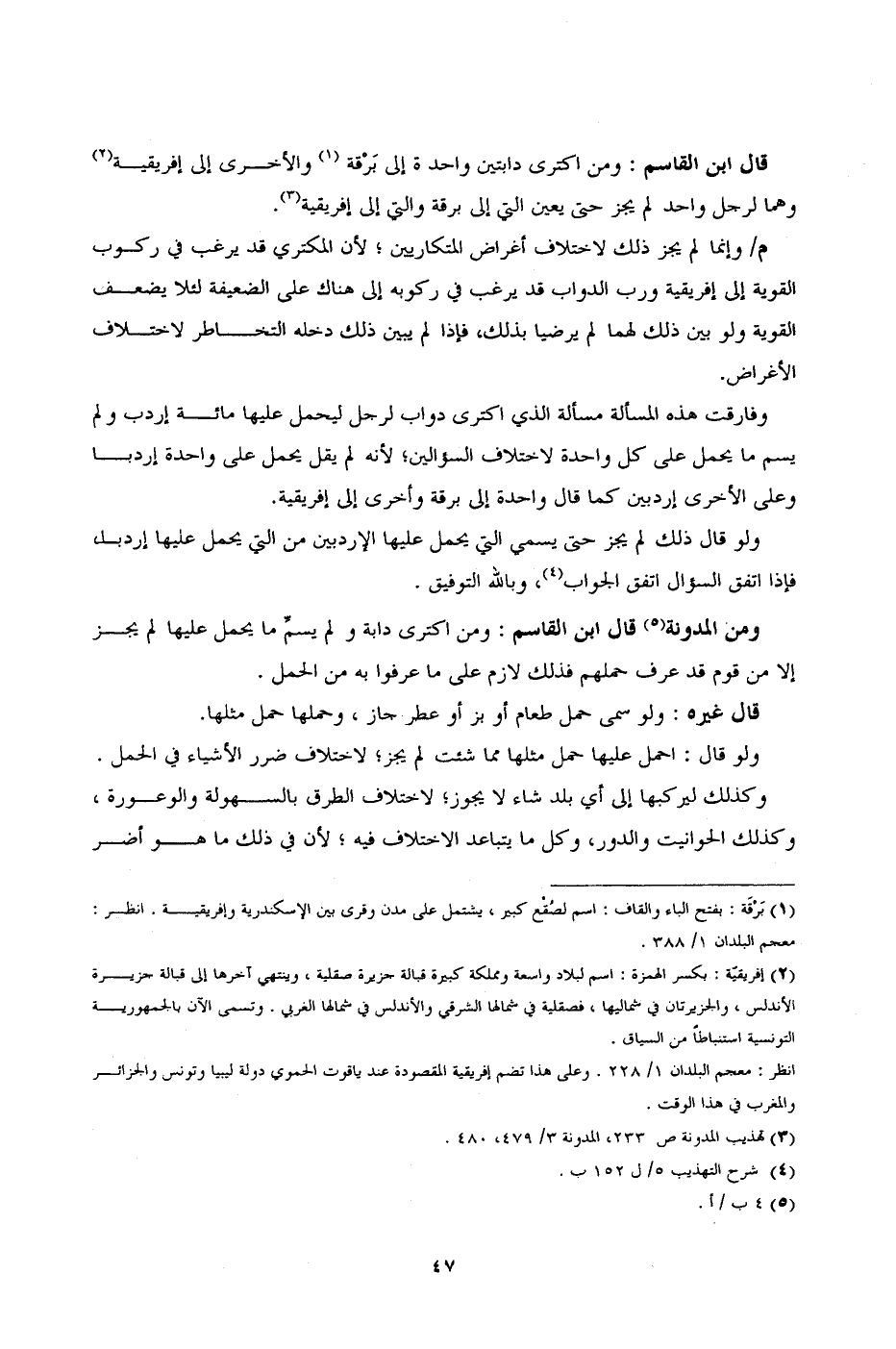 وفارقت هذه المسألة مسألة الذي اكترى دواب لرجل ليحمل عليها مائة إردب ولم يسم ما يحمل على كل واحدة لاختلاف السؤالين، لأنه لم يقل يحمل على واحدة إردباً وعلى الأخرى إردبين كما قال واحدة إلى برقة وأخرى إلى إفريقية.