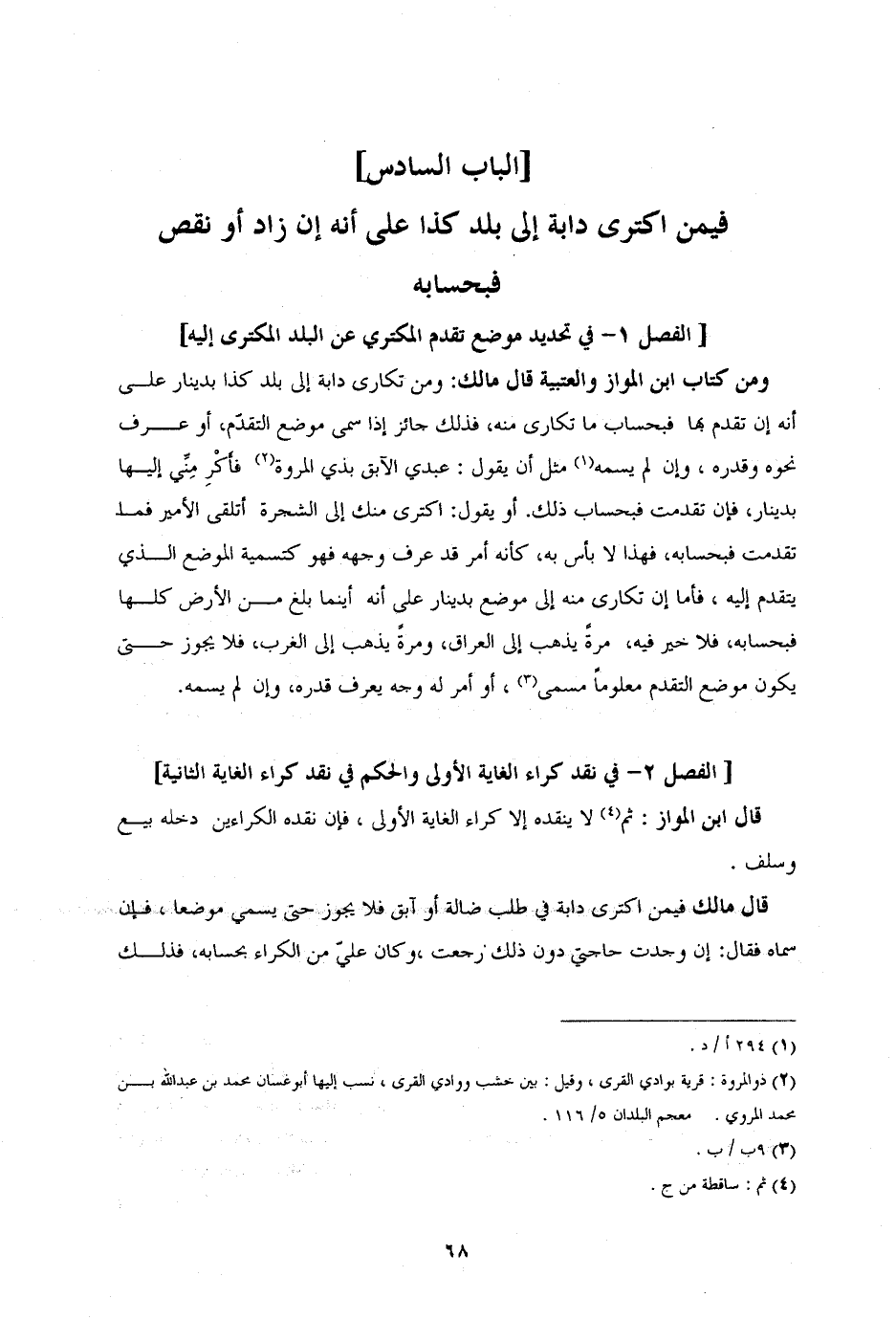ومن كتاب ابن المواز والعتبية قال مالك: ومن تكارى دابة إلى بلد كذا بدينار على أنه إن تقدم بها فبحساب ما تكارى منه، فذلك جائز إذا سمى موضع التقدم، أو عرف نحوه وقدره، وإن لم يسمه مثل أن يقول: عبدي الآبق بذي المروة فأكر مني إليها بدينار، فإن تقدمت فبحساب ذلك. أو يقول: اكترى منك إلى الشجرة أتلقى الأمير فما تقدمت فبحسابه، فهذا لا بأس به، كأنه أمر قد عرف وجهه فهو كتسمية الموضع الذي يتقدم إليه، فأما إن تكارى منه إلى موضع بدينار على أنه أينما بلغ من الأرض كلها فبحسابه، فلا خير فيه، مرة يذهب إلى العراق، ومرة يذهب إلى الغرب، فلا يجوز حتى يكون موضع التقدم معلوماً مسمى، أو أمر له وجه يعرف قدره، وإن لم يسمه.