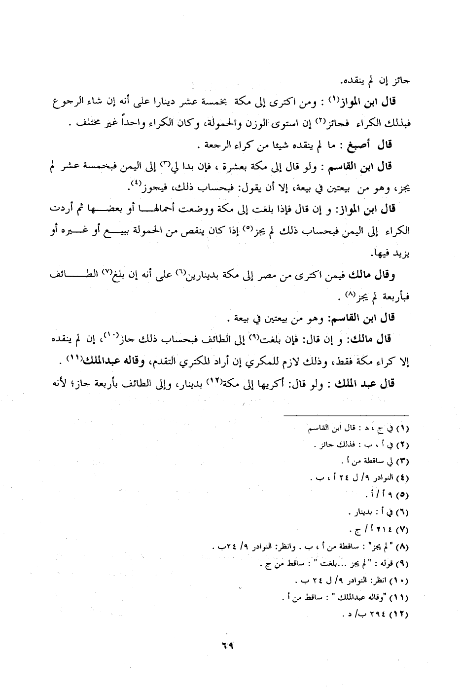 قال مالك: وإن قال: فإن بلغت إلى الطائف فبحساب ذلك جاز، إن لم ينقده إلا كراء مكة فقط، وذلك لازم للمكري إن أراد المكتري التقدم، وقاله عبد الملك.
