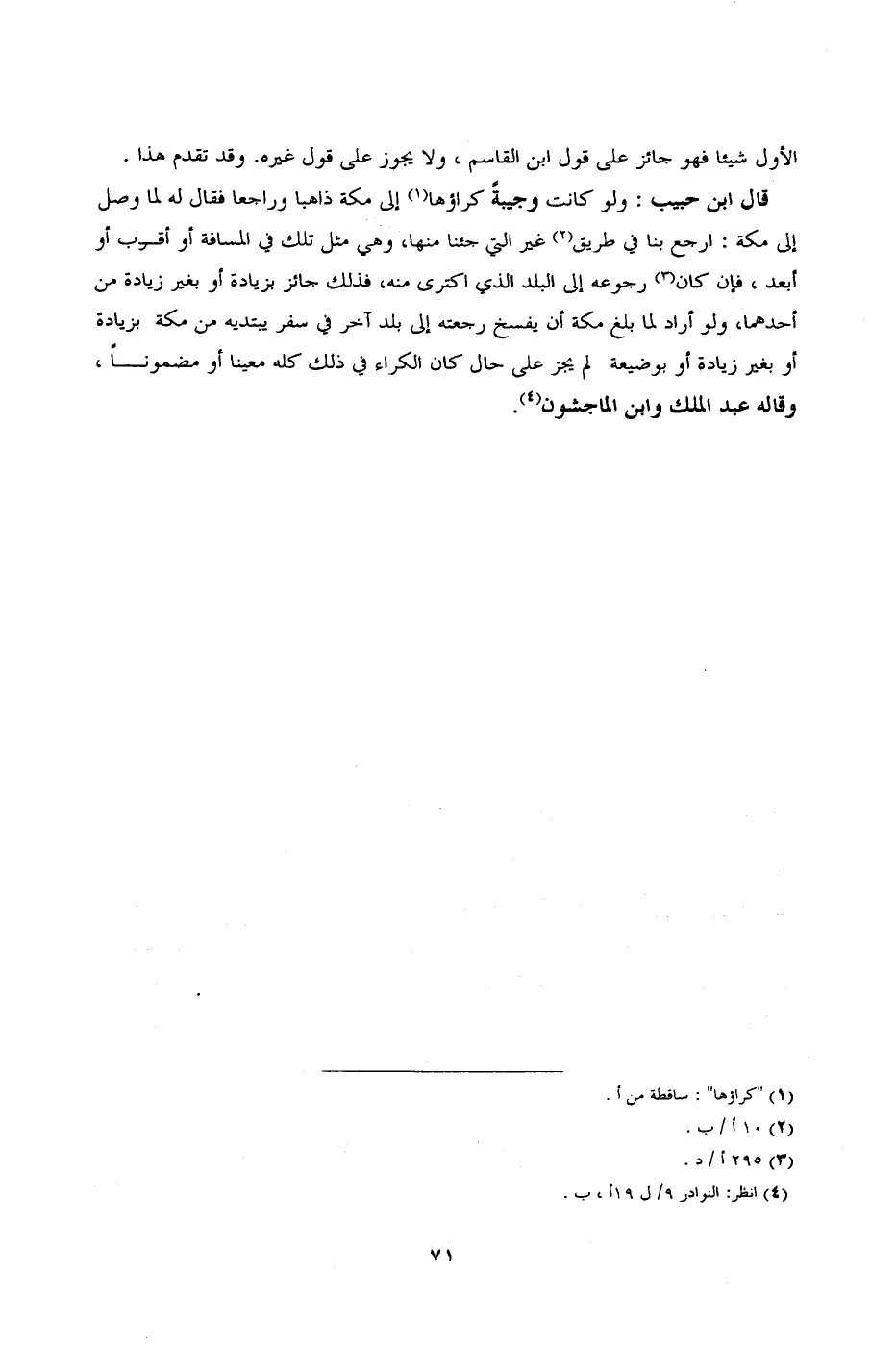 قال ابن حبيب: ولو كانت وجيبة كراؤها إلى مكة ذاهباً وراجعاً فقال له لما وصل إلى مكة: ارجع بنا في طريق غير التي جئنا منها، وهي مثل تلك في المسافة أو أقرب أو أبعد، فإن كان رجوعه إلى البلد الذي اكترى منه، فذلك جائز بزيادة أو بغير زيادة من أحدهما، ولو أراد لما بلغ مكة أن يفسخ رجعته إلى بلد آخر في سفر يبتديه من مكة بزيادة أو بغير زيادة أو بوضعية لم يجز على حال كان الكراء في ذلك كله معيناً أو مضموناً، وقاله عبد الملك وابن الماجشون.