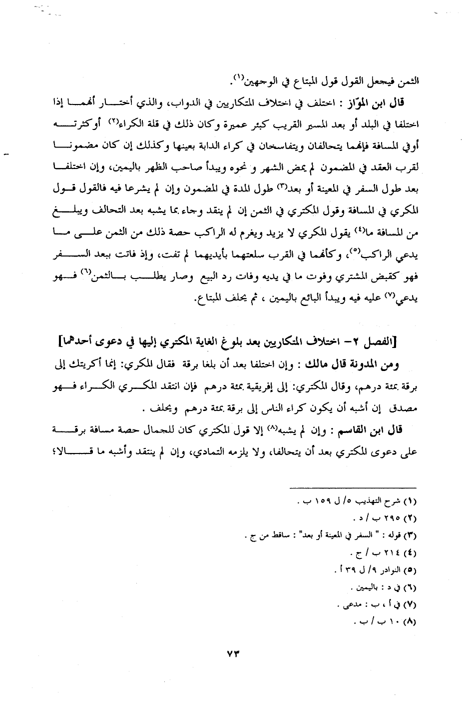 قال ابن المواز: اختلف في اختلاف المتكاريين في الدواب، والذي أختار أنهما إذا اختلفا في البلد أو بعد المسير القريب كبئر عميرة وكان ذلك في قلة الكراء أو كثرته أو في المسافة فإنهما يتحالفان ويتفاسخان في كراء الدابة بعينها وكذلك إن كان مضموناً لقرب العقد في المضمون لم يمض الشهر ونحوه ويبدأ صاحب الظهر باليمين، وإن اختلفا بعد طول السفر في المعينة أو بعد طول المدة في المضمون وإن لم يشرعا فيه فالقول قول المكري في المسافة وقول المكتري في الثمن إن لم ينقد وجاء بما يشبه بعد التحالف ويبلغ من المسافة ما يقول المكري لا يزيد ويغرم له الراكب حصة ذلك من الثمن على ما يدعى الراكب، وكأنهما في القرب سلعتهما بأيديهما لم تفت، وإذ فاتت ببعد السفر فهو كقبض المشتري وفوت ما في يديه وفات رد البيع وصار ما يطلب بالثمن فهو يدعي عليه فيه ويبدأ البائع باليمين، ثم يحلف المبتاع.