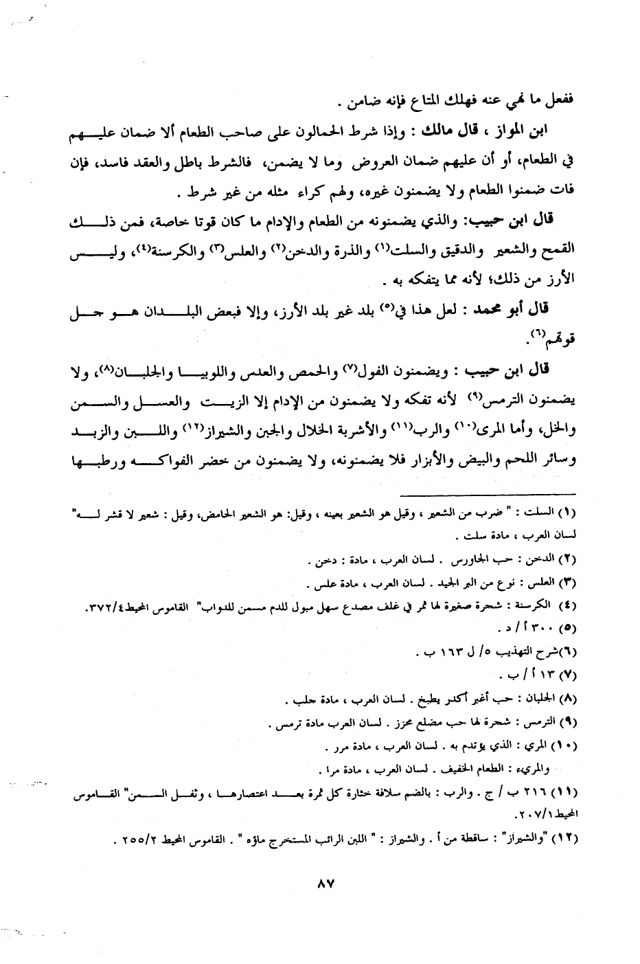 قال ابن حبيب: والذي يضمنونه من الطعام والإدام ما كان قوتاً خاصة، فمن ذلك القمح والشعير والدقيق والسلت والذرة والدخن والعلس والكرسنة، وليس الأرز من ذلك؛ لأنه مما يتفكه به.
