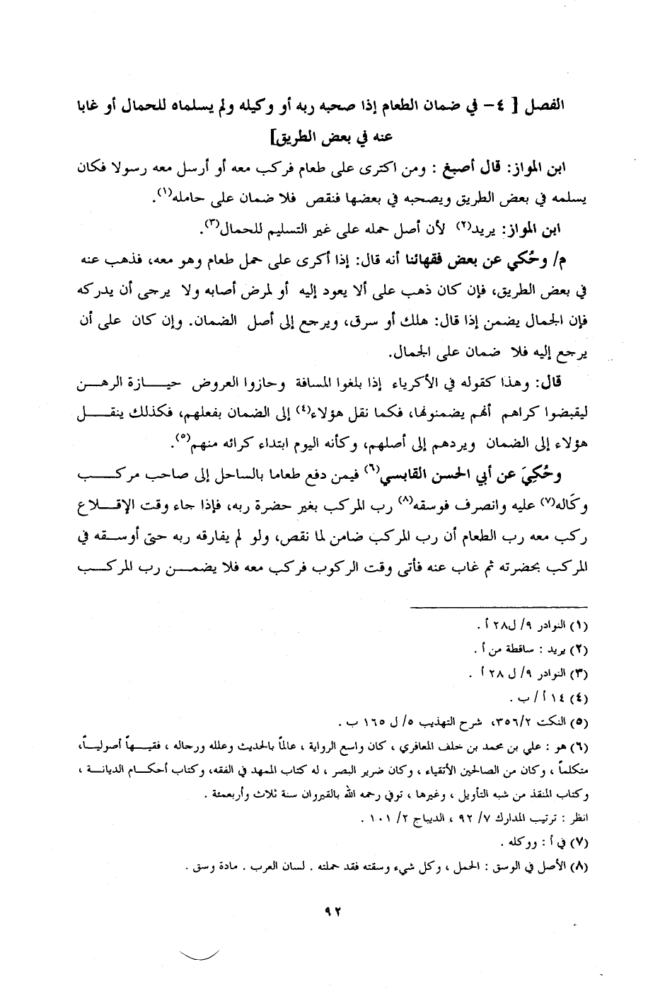 ابن المواز: قال أصبغ: ومن اكترى على طعام فركب معه أو أرسل معه رسولاً فكان يسلمه في بعض الطريق ويصحبه في بعضها فنقص فلا ضمان على حامله.