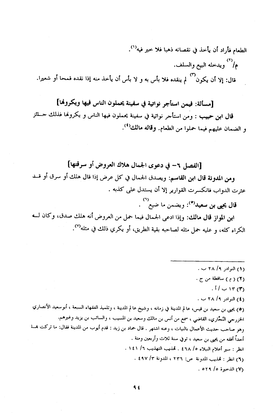 قال ابن حبيب: ومن استأجر نواتية في سفينة يحملون فيها الناس ويكرونها فذلك جائز والضمان عليهم فيما حملوا من الطعام. وقاله مالك.