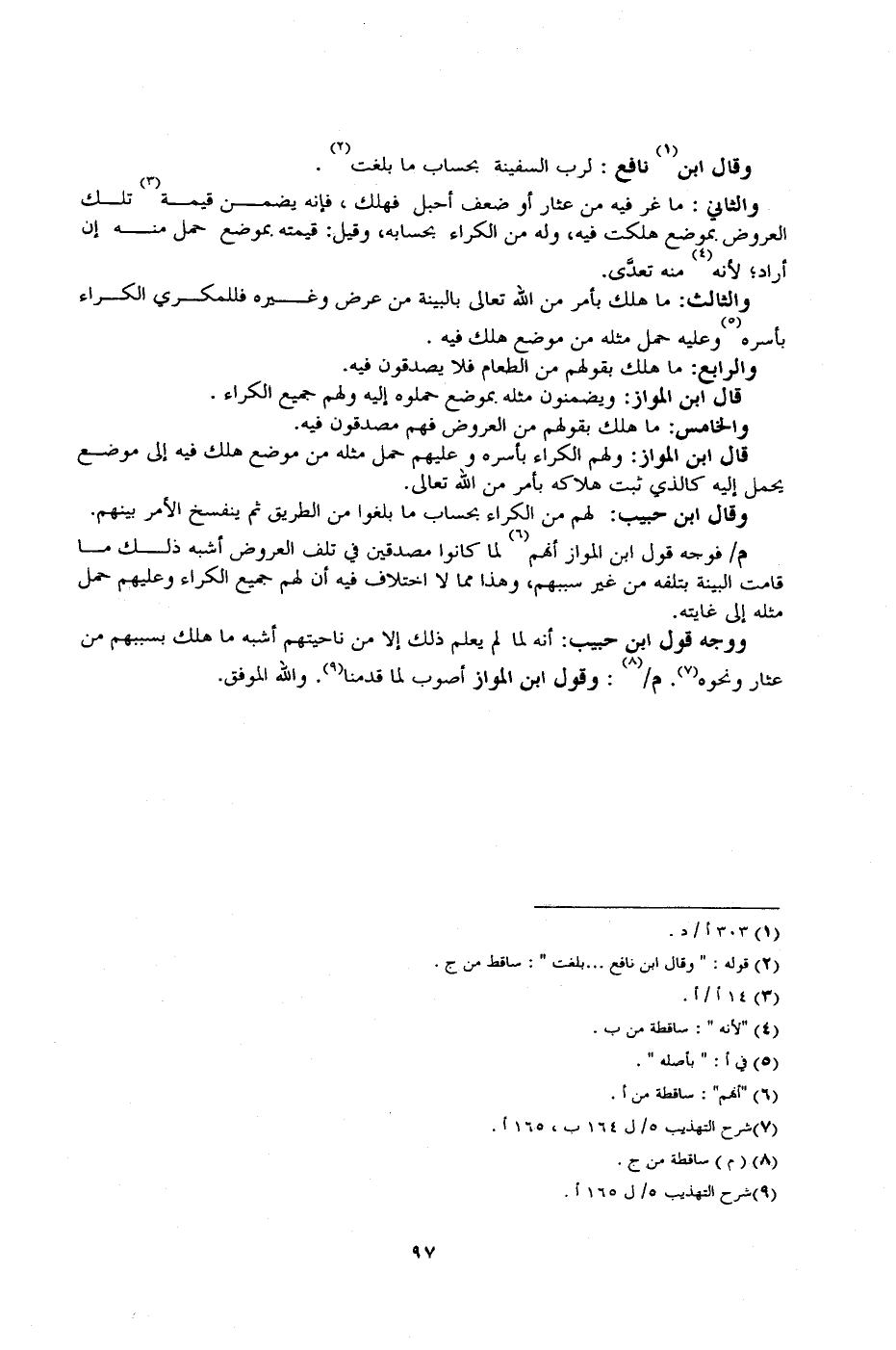 ووجه قول ابن حبيب: أنه لما لم يعلم ذلك إلا من ناحيتهم أشبه ما هلك بسببهم من عثار ونحوه. م/: وقول ابن المواز أصوب لما قدمنا. والله الموفق.