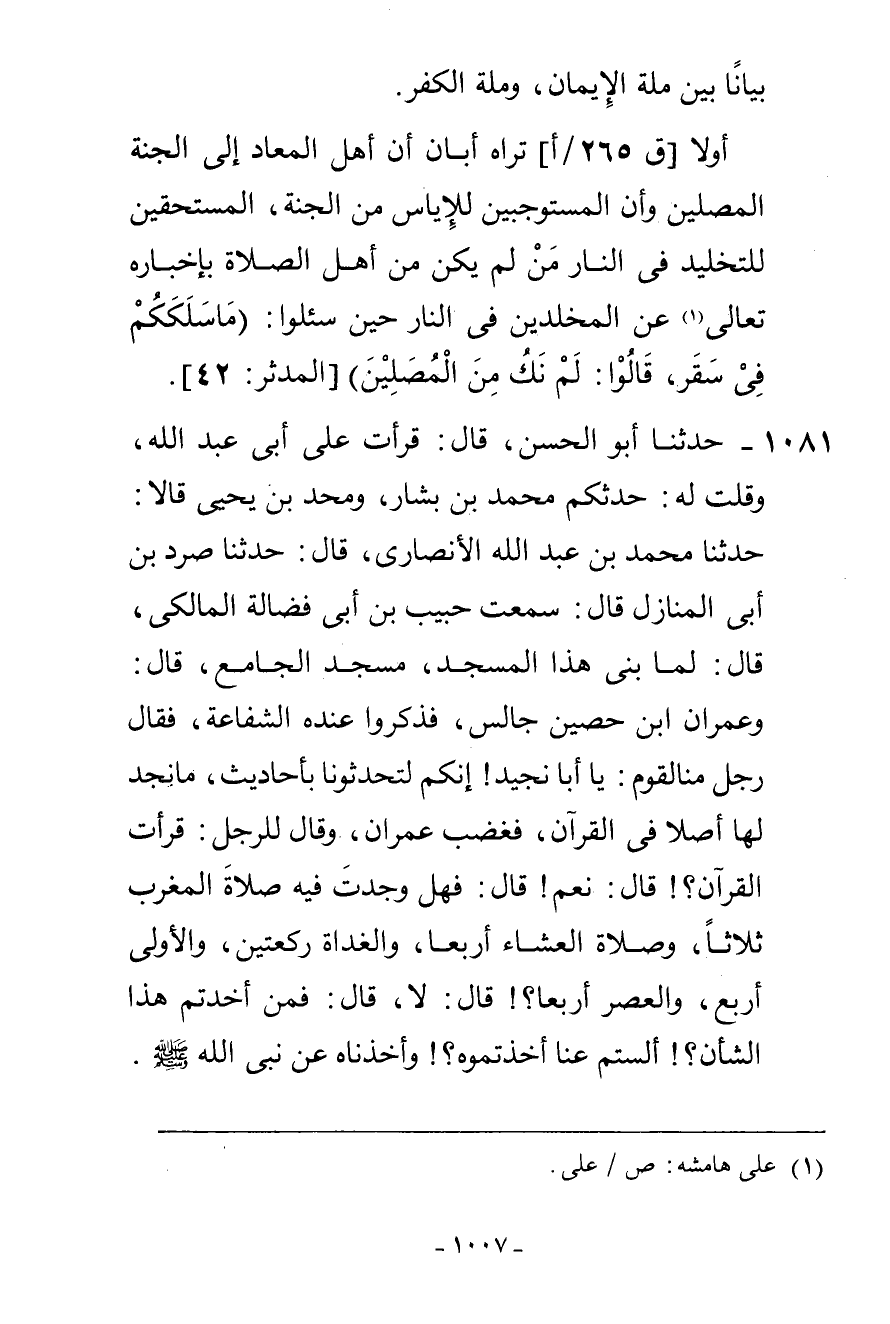 1081 - حَدَّثَنَا أَبُو الْحَسَنِ، قَالَ: قَرَأْتُ عَلَى أَبِي عَبْدِ اللَّهِ، وَقُلْتُ لَهُ: حَدَّثَكُمْ مُحَمَّدُ بْنُ بَشَّارٍ، وَمُحَمَّدُ بْنُ يَحْيَى، قَالَا: حَدَّثَنَا مُحَمَّدُ بْنُ عَبْدِ اللَّهِ الْأَنْصَارِيُّ، قَالَ: حَدَّثَنَا صُرَدُ بْنُ أَبِي الْمَنَازِلِ، قَالَ: سَمِعْتُ حَبِيبَ بْنَ أَبِي فَضَالَةَ الْمَالِكِيَّ، قَالَ: لَمَّا بُنِيَ هَذَا الْمَسْجِدُ مَسْجِدُ الْجَامِعِ قَالَ: وَعِمْرَانُ بْنُ حُصَيْنٍ جَالِسٌ فَذَكَرُوا عِنْدَهُ الشَّفَاعَةَ فَقَالَ رَجُلٌ مِنَ الْقَوْمِ: يََا أَبَا نُجَيْدِ إِنَّكُمْ لَتُحَدِّثُونَا بِأَحَادِيثَ مَا نَجِدُ لَهَا أَصْلًا فِي الْقُرْآنِ فَغَضِبَ عِمْرَانُ وَقَالَ لِلرَّجُلِ: قَرَأْتَ الْقُرْآنَ؟ قَالَ: نَعَمْ، قَالَ: فَهَلْ وَجَدْتَ فِيهِ صَلَاةَ الْمَغْرِبِ ثَلَاثًا وَصَلَاةَ الْعِشَاءِ أَرْبَعًا وَالْغَدَاةَ رَكْعَتَيْنِ وَالْأُولَى أَرْبَعٌ وَالْعَصْرَ أَرْبَعًا قَالَ: لَا، قَالَ: فَمِمَّنْ أَخَدْتُمْ هَذَا الشَّأْنَ؟ أَلَسْتُمْ عَنَّا أَخَذْتُمُوهُ وَأَخَذْنَاهُ عَنْ نَبِيِّ اللَّهِ صَلَّى اللهُ عَلَيْهِ وَسَلَّمَ -[1008]-، أَوَجَدْتُمْ فِي ذَلِكَ في أَرْبَعِينَ دِينَارًا دِينَارٌ، وَفِي كُلِّ كَذَا وَكَذَا شَاةٍ، وَكُلُّ كَذَا وَكَذَا بَعِيرٍ كَذَا أَوَجَدْتُمْ هَذَا فِي الْقُرْآنِ؟ قَالَ: لَا، قَالَ: فَعَنْ مَنْ أَخَذْتُمْ هَذَا الشَّأْنَ؟ أَخَذْنَاهُ عَنْ نَبِيِّ اللَّهِ صَلَّى اللهُ عَلَيْهِ وَسَلَّمَ وَأَخَذْتُمُوهُ عَنَّا هَلْ وَجَدْتُمْ فِي الْقُرْآنِ: {وَلْيَطَّوَّفُوا بِالْبَيْتِ الْعَتِيقِ} [الحج: 29] وَجَدْتُمْ: طُوفُوا سَبْعًا وَارْكَعُوا رَكْعَتَيْنِ خَلْفَ الْمَقَامِ أَوَجَدْتُمْ هَذَا فِي الْقُرْآنِ؟ عَنْ مَنْ أَخَذْتُمُوهُ أَلَسْتُمْ أَخَذْتُمُوهُ عَنَّا وَأَخَذْنَاهُ عَنْ نَبِيِّ اللَّهِ صَلَّى اللهُ عَلَيْهِ وَسَلَّمَ؟ قَالَ: بَلَى، فَقَالَ: وَجَدْتُمْ فِي الْقُرْآنِ: §لَا جَلْبَ، وَلَا جُنُبَ، وَلَا شِغَارَ فِي الْإِسْلَامِ؟ قَالَ: لَا، قَالَ عِمْرَانُ: فَإِنِّي سَمِعْتُ رَسُولَ اللَّهِ صَلَّى اللهُ عَلَيْهِ وَسَلَّمَ يَقُولُ: «لَا جَلْبَ، وَلَا جُنُبَ، وَلَا شِغَارَ فِي الْإِسْلَامِ» أَسَمِعْتُمُ اللَّهَ تَعَالَى يَقُولُ لِأَقْوَامٍ فِي كِتَابِهِ: {مَا سَلَكَكُمْ فِي سَقَرَ قَالُوا لَمْ نَكُ مِنَ الْمُصَلِّينَ وَلَمْ نَكُ نُطْعِمُ الْمِسْكِينَ} [المدثر: 43] حَتَّى بَلَغَ: {فَمَا تَنْفَعُهُمْ شَفَاعَةُ الشَّافِعِينَ} [المدثر: 48] قَالَ حَبِيبٌ رَضِيَ اللَّهُ عَنْهُ: فَأَنَا سَمِعْتُ عِمْرَانَ بْنَ حُصَيْنٍ رَضِيَ اللَّهُ عَنْهُ يَقُولُ: " الشَّفَاعَةُ نَافِعَةٌ دُونَ مَا يَسْمَعُونَ -[1009]- قَالَ أَبُو عَبْدِ اللَّهِ: أَفَلَا تَرَى أَنَّ تَارِكَ الصَّلَاةِ لَيْسَ مِنْ أَهْلِ مِلَّةِ الْإِسْلَامِ الَّذِينَ يُرْجَى لَهُمُ الْخُرُوجُ مِنَ النَّارِ وَدُخُولُ الْجَنَّةِ بِشَفَاعَةِ الشَّافِعِينَ كَمَا قَالَ صَلَّى اللهُ عَلَيْهِ وَسَلَّمَ فِي حَدِيثِ الشَّفَاعَةِ الَّذِي رَوَاهُ أَبُو هُرَيْرَةَ وَأَبُو سَعِيدٍ جَمِيعًا رَضِيَ اللَّهُ عَنْهُمَا أَنَّهُمْ يَخْرُجُونَ مِنَ النَّارِ يُعْرَفُونَ بِآثَارِ السُّجُودِ فَقَدْ بَيَّنَ لَكَ أَنَّ الْمُسْتَحِقِّينَ لِلْخُرُوجِ مِنَ النَّارِ بِالشَّفَاعَةِ هُمُ الْمُصَلُّونَ -[1010]-. أَوَ لَا تَرَى أَنَّ اللَّهَ تَعَالَى مَيَّزَ بَيْنَ أَهْلِ الْإِيمَانِ وَأَهْلِ النِّفَاقِ بِالسُّجُودِ فَقَالَ تَعَالَى: {يَوْمَ يُكْشَفُ عَنْ سَاقٍ وَيُدْعَوْنَ إِلَى السُّجُودِ فَلَا يَسْتَطِيعُونَ} [القلم: 42] وَقَدْ ذَكَرْنَا الْأَخْبَارَ الْمَرْوِيَّةَ فِي تَفْسِيرِ الْآيَةِ فِي صَدْرِ كِتَابِنَا، فَقَالَ اللَّهُ تَعَالَى: {وَإِذَا قِيلَ لَهُمُ ارْكَعُوا لَا يَرْكَعُونَ} [المرسلات: 