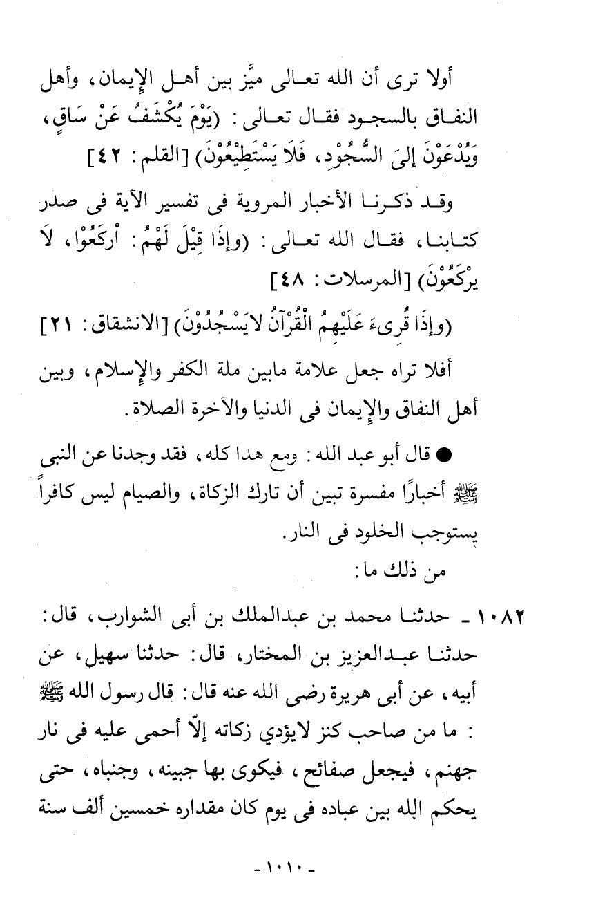 1082 - حَدَّثَنَا مُحَمَّدُ بْنُ عَبْدِ الْمَلِكِ بْنِ أَبِي الشَّوَارِبِ، قَالَ: حَدَّثَنَا عَبْدُ الْعَزِيزِ بْنُ الْمُخْتَارِ، قَالَ: حَدَّثَنَا سُهَيْلٌ، عَنْ أَبِيهِ، عَنْ أَبِي هُرَيْرَةَ، رَضِيَ اللَّهُ عَنْهُ قَالَ: قَالَ رَسُولُ اللَّهِ صَلَّى اللهُ عَلَيْهِ وَسَلَّمَ: " §مَا مِنْ صَاحِبِ كَنْزٍ لَا يُؤَدِّي زَكَاتَهُ إِلَّا أُحْمِيَ عَلَيْهِ فِي نَارِ جَهَنَّمَ فَيُجْعَلَ صَفَائِحَ فَيُكْوَى بِهَا جَبِينُهُ وَجَنْبَاهُ حَتَّى يَحْكُمَ اللَّهُ بَيْنَ عِبَادِهِ فِي يَوْمٍ كَانَ مِقْدَارُهُ خَمْسِينَ أَلْفَ سَنَةٍ -[1011]- مِمَّا تَعُدُّونَ، ثُمَّ يَرَى سَبِيلَهُ إِمَّا إِلَى الْجَنَّةِ وَإِمَّا إِلَى النَّارِ، وَمَا مِنْ صَاحِبِ غَنَمٍ لَا يُؤَدِّي زَكَاتَهَا إِلَّا بُطِحَ لَهَا بِقَاعٍ قَرْقَرٍ كَأَوْفَرِ مَا كَانَتْ فَتَطَؤُهُ بِأَظْلَافِهَا وَتَنْطَحُهُ بِقُرُونِهَا، لَيْسَ فِيهَا عَضْبَاءُ وَلَا جَلْحَاءُ كُلُّ مَا مَضَى عَلَيْهِ أُخْرَاهَا رُدَّتْ عَلَيْهِ أُولَاهَا حَتَّى يَحْكُمَ اللَّهُ بَيْنَ عِبَادِهِ فِي يَوْمٍ كَانَ مِقْدَارُهُ خَمْسِينَ أَلْفَ سَنَةٍ مِمَّا تَعُدُّونَ ثُمَّ يَرَى وَيَرَى سَبِيلَهُ إِمَّا إِلَى الْجَنَّةِ وَإِمَّا إِلَى النَّارِ قَالَ سُهَيْلٌ مَرَّةً أُخْرَى: وَلَا أَدْرِي أَذَكَرَ الْبَقَرَ أَمْ لَا