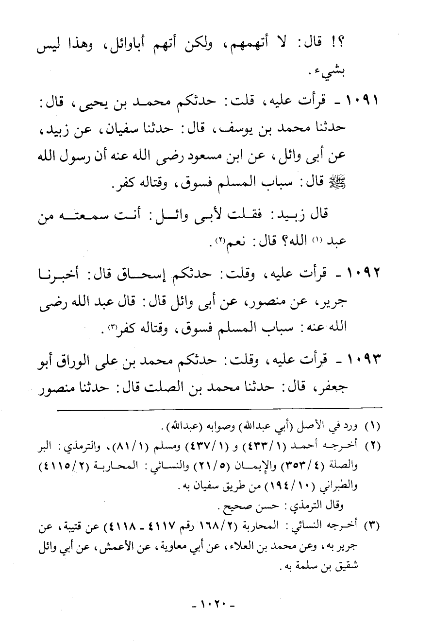 1091 - قَرَأْتُ عَلَيْهِ، قُلْتُ: حَدَّثَكُمْ مُحَمَّدُ بْنُ يَحْيَى، قَالَ: حَدَّثَنَا مُحَمَّدُ بْنُ يُوسُفَ، قَالَ: حَدَّثَنَا سُفْيَانُ، عَنْ زُبَيْدٍ، عَنْ أَبِي وَائِلٍ، عَنِ ابْنِ مَسْعُودٍ، رَضِيَ اللَّهُ عَنْهُ أَنَّ رَسُولَ اللَّهِ صَلَّى اللهُ عَلَيْهِ وَسَلَّمَ قَالَ: «§سِبَابُ الْمُسْلِمِ فُسُوقٌ وَقِتَالُهُ كُفْرٌ» قَالَ زُبَيْدٌ: فَقُلْتُ لِأَبِي وَائِلٍ: أَنْتَ سَمِعْتُهُ مِنْ عَبْدِ اللَّهِ؟ قَالَ: نَعَمْ